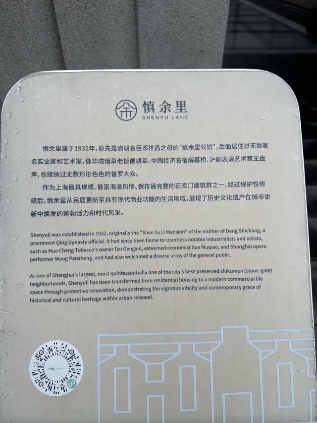 旅の径拥有4.2万平方米绿地、6万余平方米商业面积的苏河湾万象天地,包含着旧貌换新颜的慎余里。 始建于1932年的慎余里,地处苏州河畔,当年许多银行、钱庄的老板选择在周边盖建仓库,同时也在此处居住,一度成为上海富豪与名流的聚居地。 慎余里,内有7条弄堂、近50幢石库门建筑,规划工整,立面庄正,清砖及顶,双开间一厢房格局,是苏州河北岸最精致的石库门里弄、上海保存最为完整的石库门建筑群之一。 2012年,在新的城市化建设进程中,对慎余里进行了保护性拆除;2020-2022年,建造苏河湾万象天地时,恢复性重建了8幢建筑,定位于高端餐饮和买手型商业销售,造就了新的慎余里。 漫步其间,粗看,镌刻着“慎余里”三个大字的过街楼+一纵三横的弄堂布局+一色清砖的外立面,海派情调依稀可见;细瞧,家长里短的烟火气已烟消云散,前卫奢华的时尚风正徐徐吹来…但愿初心永不改、明天会更好。