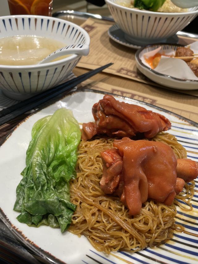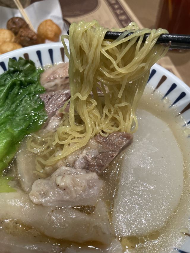 水记路环面家(环贸iapm店)走一个~不是香港澳门开来的店新名字看着像而已。 清汤牛筋腩面~汤面竹升面软烂了点,牛筋可以,牛腩普通,萝卜和汤底也还可以~ 水记猪手面~捞面竹升面软烂了点,味道咸,猪手普通~ 炸鱼肉牛肉丸+冻柠茶还可以~