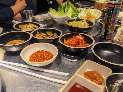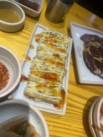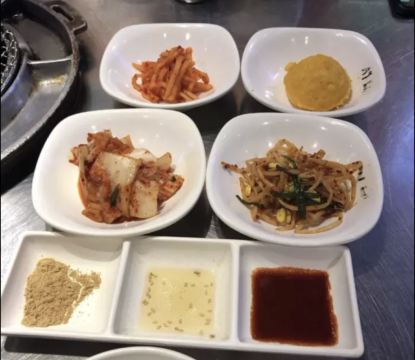 牛舌,海鲜葱饼,牛肋条肉,餐前小菜,泡菜饼,鸡蛋卷,大酱汤,南瓜土豆泥,芝士拉面年糕,雪米酒,炒年糕,大肠,护心肉,牛五花肉,五花肉,石锅拌饭,猪颈肉,大酱护心肉,嫩豆腐汤,五味护心肉,韩国炒杂菜,米饭