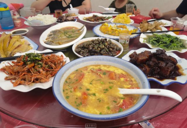 白斩鸡,油爆虾,崇明金瓜丝,崇明糕,毛蟹炒年糕,银鱼跑蛋,芋奶扁豆,红烧羊肉,鳝筒,清蒸梅子鱼,蔥油芋艿,炒菠菜,红烧昂刺鱼,蛋饺白菜汤
