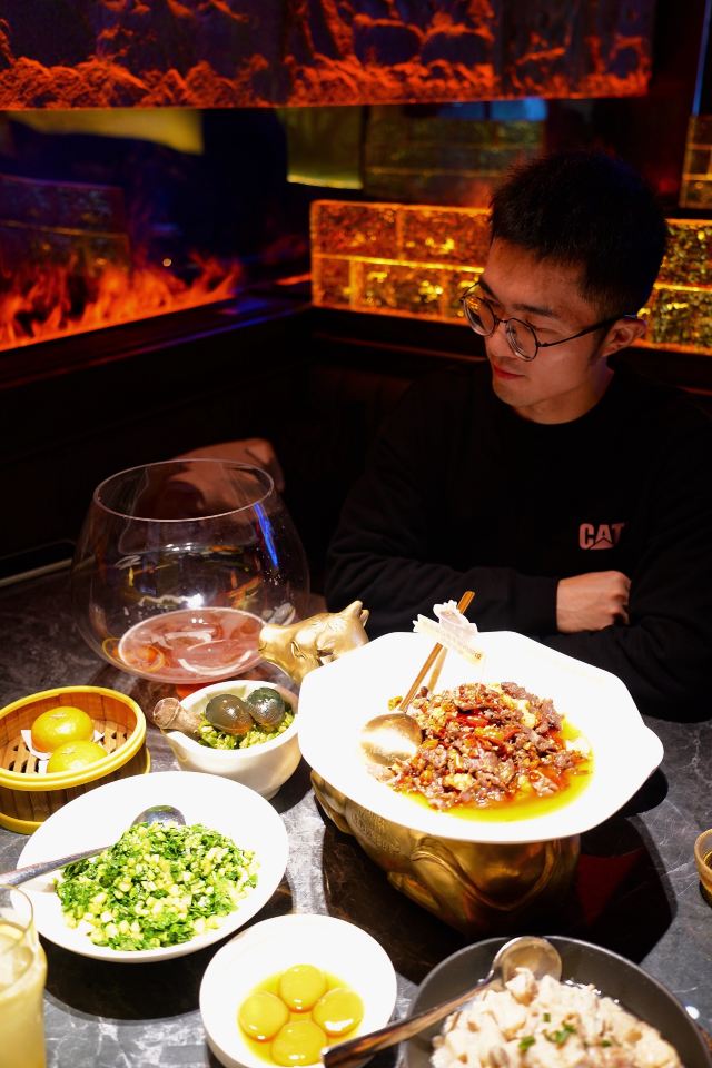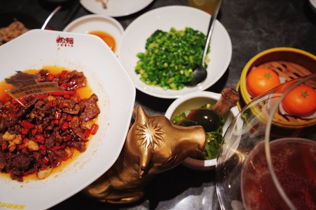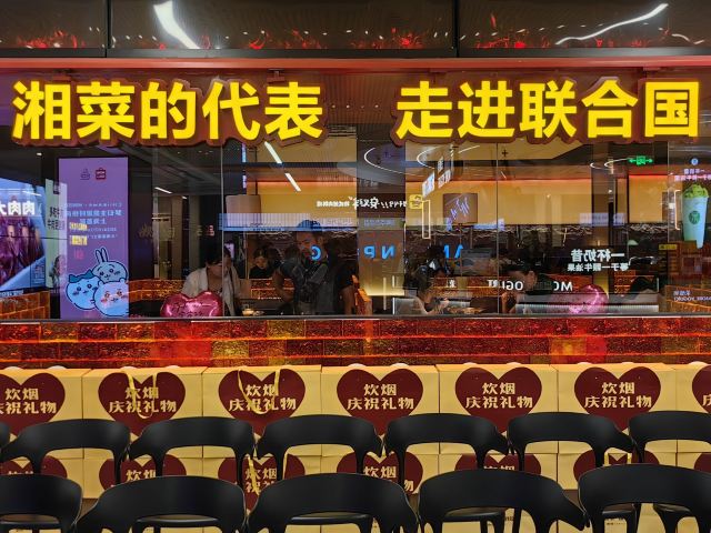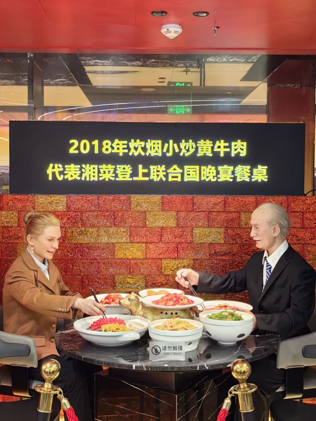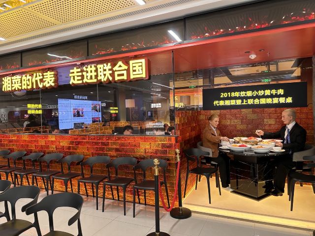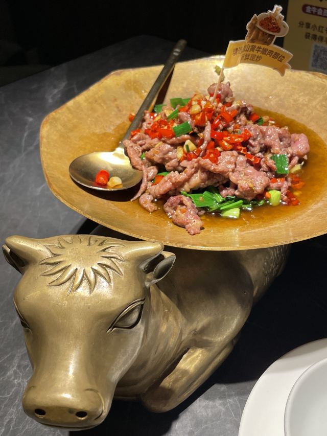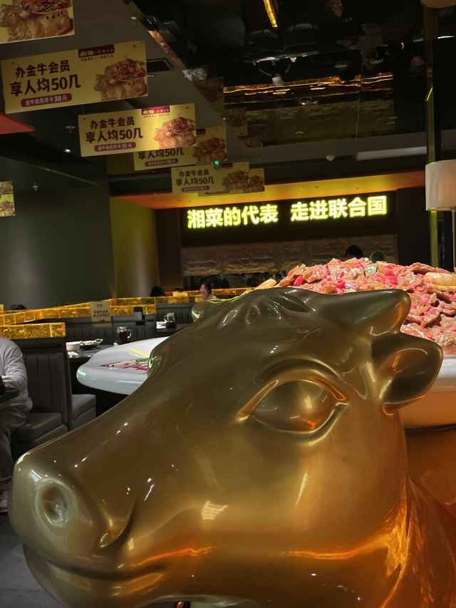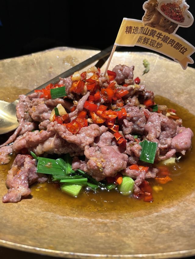 呕吼 我也是能吃湘菜的人了 湘菜之辣 听闻 可比四川重庆湖南贵州辣的多 对于一个不吃辣的魔都娃囝来说 这个选择太难了 可是 禁不住门口几个大字“走进联合国” 想来联合国也不是都吃辣的吧 抱着试一试的心态 进来试一试 小炒黄牛肉是必点的 仪式感也很足 还给你个专门保温的铜牛锅做底 至于口味嘛 够嫩够爽够好吃 没有想象中的辣 是自己可以接受的程度 但是很香 很上头 至于其他菜式 问了服务员 有些特别辣的还是要避开 总体感觉不错 给我打开了新世界 原来湘菜馆也是可以体验尝试的 哎呦 不错哦