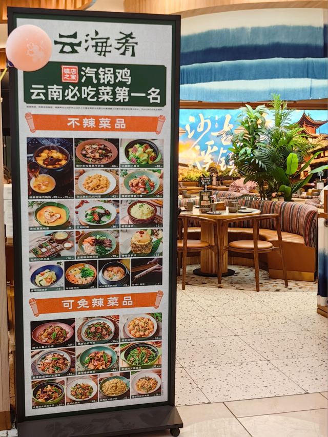 汽锅鸡,小锅米线,黑糖豆花,傣味烤五花肉,黑松露牛肝菌焖牛蛙,老奶洋芋,泡鲁达,野生牛肝菌火腿洋芋闷饭,烤破酥包,黑三剁,诺邓火腿焖小麦瓜,酸汤鱼,个旧烤猪蹄,鸡丝凉米线,原味汽锅鸡,菌皇汽锅鸡,香茅草烤罗非鱼,包烧野生牛肝菌,蒜香火腿包浆豆腐,云海肴汽锅鸡,玫瑰鲜花饼,咕嘟肉沫包浆豆腐,云南过桥米线