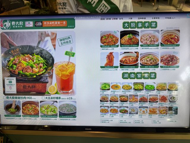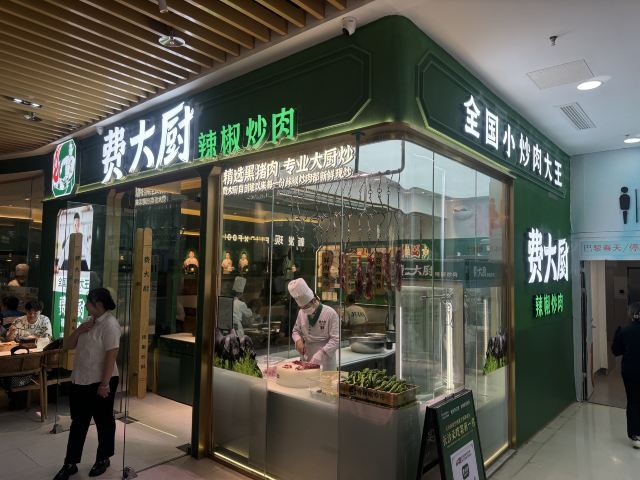 号称全国有100多家分店,敞开式门面店堂分隔了几个区域,装修环境绿色为底干净明亮。 由于生意好稍微等了一下才被引领就坐,服务态度很好,上辣椒炒肉的时候服务员还搞个开盖解说的上菜仪式。 费大厨辣椒炒肉68元一锅是店内的招牌菜,湘菜头牌长沙必吃菜第一名。黑猪肉炒的很嫩带着醇浓的酱汁,将辣椒香辣与猪肉的鲜美完美融合,地耳滑脆辣很过瘾,配上软糯柔韧的东北鲜米超级下饭,所以每桌配个小电饭煲。米饭5元一位免费续,不知道吃剩的米饭怎么处理。 皮蛋青椒擂茄子35元,经过捣烂处理后,茄子、青椒很酥软混合皮蛋,几乎尝不出原本的味道,微微有些辣蛮咸鲜融合。 打卡收藏送核桃包松软香甜核桃仁蛮多。 菜品很有湖南特色,价格实惠干饭人的好去处。