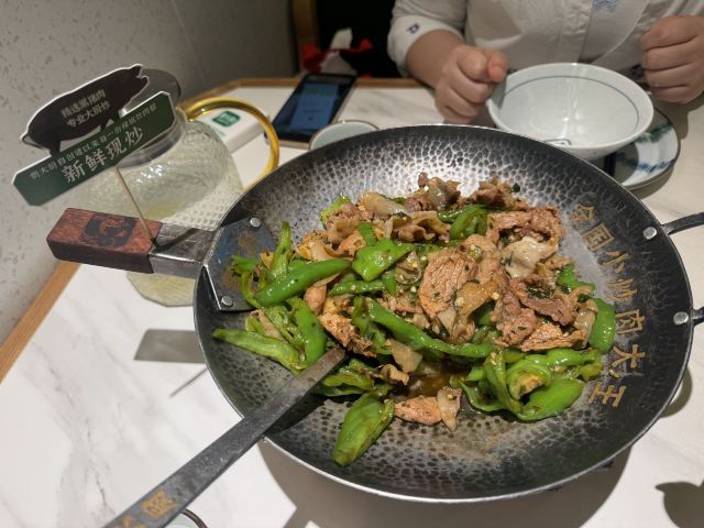 食神牛号称全国有100多家分店,敞开式门面店堂分隔了几个区域,装修环境绿色为底干净明亮。 由于生意好稍微等了一下才被引领就坐,服务态度很好,上辣椒炒肉的时候服务员还搞个开盖解说的上菜仪式。 费大厨辣椒炒肉68元一锅是店内的招牌菜,湘菜头牌长沙必吃菜第一名。黑猪肉炒的很嫩带着醇浓的酱汁,将辣椒香辣与猪肉的鲜美完美融合,地耳滑脆辣很过瘾,配上软糯柔韧的东北鲜米超级下饭,所以每桌配个小电饭煲。米饭5元一位免费续,不知道吃剩的米饭怎么处理。 皮蛋青椒擂茄子35元,经过捣烂处理后,茄子、青椒很酥软混合皮蛋,几乎尝不出原本的味道,微微有些辣蛮咸鲜融合。 打卡收藏送核桃包松软香甜核桃仁蛮多。 菜品很有湖南特色,价格实惠干饭人的好去处。