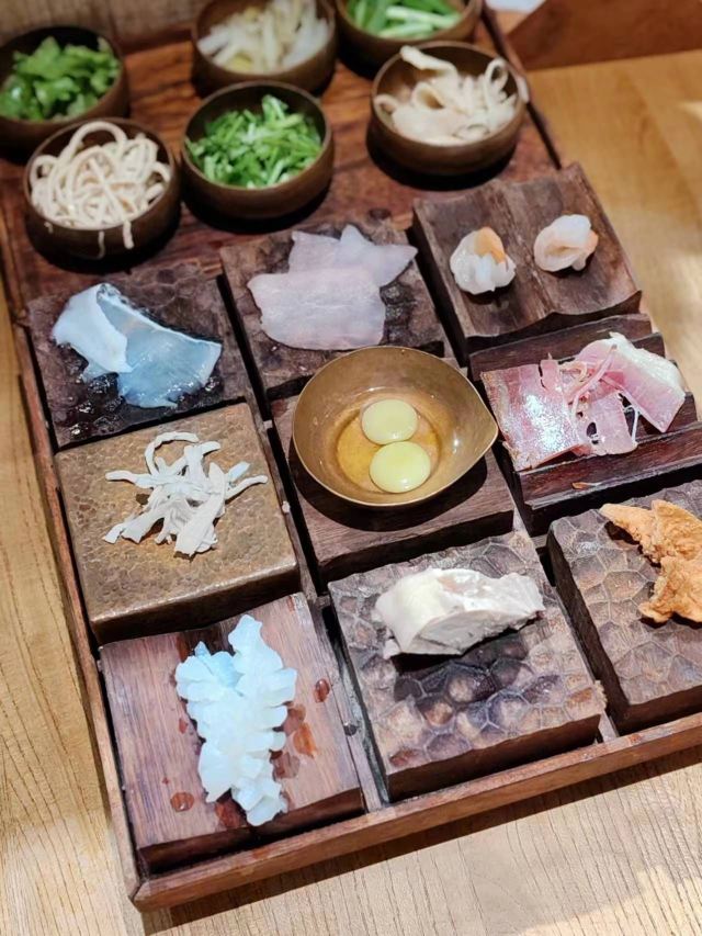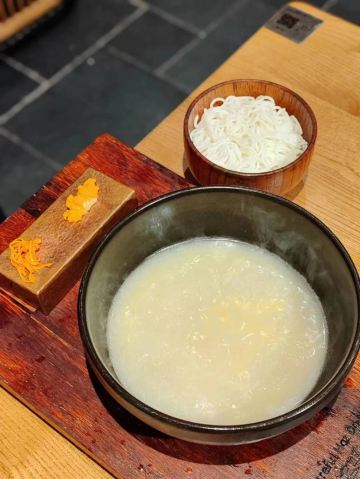 amydog这该死的云南米线仪式感😋真特么很赞 2023-9-26 高举一杯发财酒,今日份直奔主题,捞钱捞米线💰 源于前一天梦到了朴老师用筷子在碗里捞东西,却不记得是在捞什么了,醒来之后和朴老师说了这个梦,朴老师说在捞钱😂 期待财源滚滚每一天💰 【口味】 |云南松茸竹荪菌汤米线^68,在上海是第一次吃这么有仪式感的云南米线,上一次吃这样子这么多碟浇头的米线,还是上一次那年在昆明😁🍄鲜美无比的云南松茸竹荪菌汤,令人印象深刻,对比朴老师的普通版|云南传统过桥米线^,真的是高下立竿见影了,瞬间就知道普通版一点都不香了,"寡淡"得很.除了汤底的不同,配菜两种米线是一毛一样的,20的价差就是汤底 |五彩荷包蛋^15,不知该如何形容🍳并不是想象中的一只五颜六色的荷包蛋,而是一只荷包蛋切开放点辣椒丝糖醋拌 |荔枝青提冰瓜^冰冬瓜,谁吃谁知道打卡每人可以送一份,吃了一块之后觉得不需要另一个人再打卡了,并且这个昆明人表示在老家从未吃过 |傣味烤鱼^39,有点满辣的,没吃几口,朴老师说好吃 |发财酒^15,是冰酒酿里加了玫瑰花瓣,很好喝,就是和瑞幸一样,半杯冰块,吸了没几口就吸不出了伊讲 |鲜花饼^5,普普通通 决定去这家捞钱,哦不,是捞米线之后,上海鲜市场逛了一圈,竟然搜到55的票子,马上命令朴老师再点点东西凑200,不然150和200实际付的是一样的呢,机智的朴老师竟然凑出了200整,服气 【服务】 5点钟人已经蛮多了,双人桌已经满了,只剩四人桌和图9的吧台,艾小米直接坐了四人桌,一位像是经理模样的人过来要求艾小米做坐到吧台那里,怕后面来四个人的,但是语气不是很好,非常生硬,让人不太舒服 艾小米也就不客气直说了,如果有四个人过来我再让,或者等有双人桌你来喊我换,后来空出来了双人桌,艾小米当然是会礼貌换桌咯 【环境】 很舒服宽敞的米线店,有云南元素,但不多😄没有细节,当然也是和客单价匹配的环境
