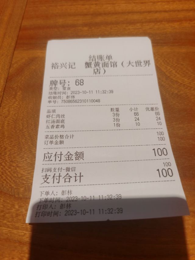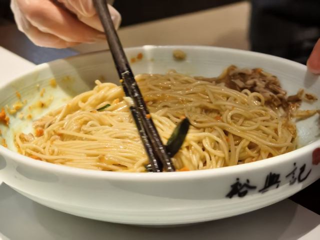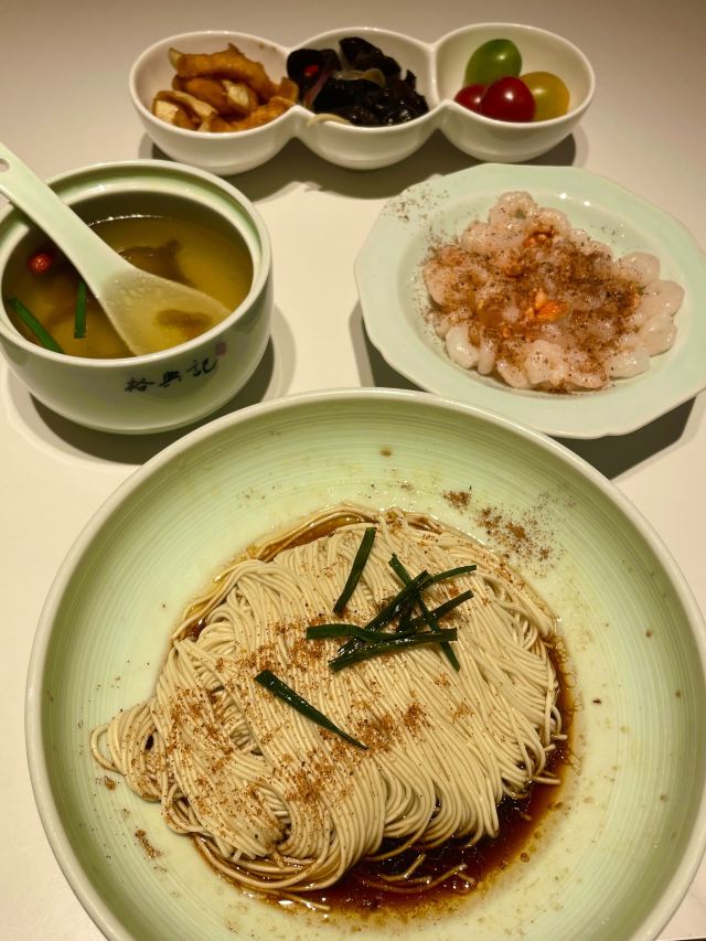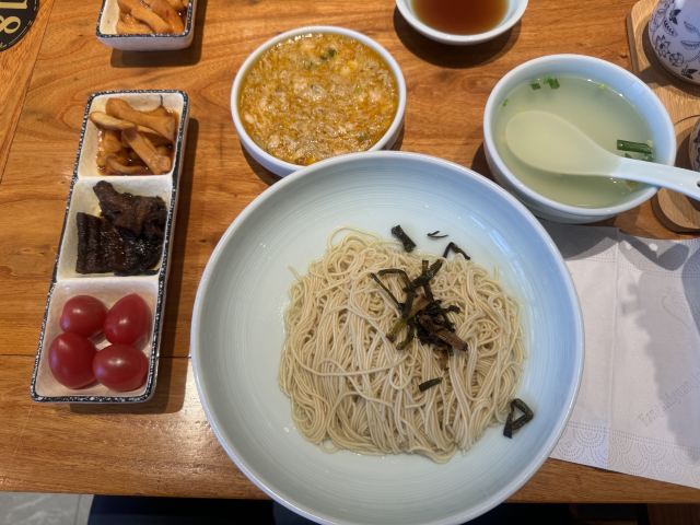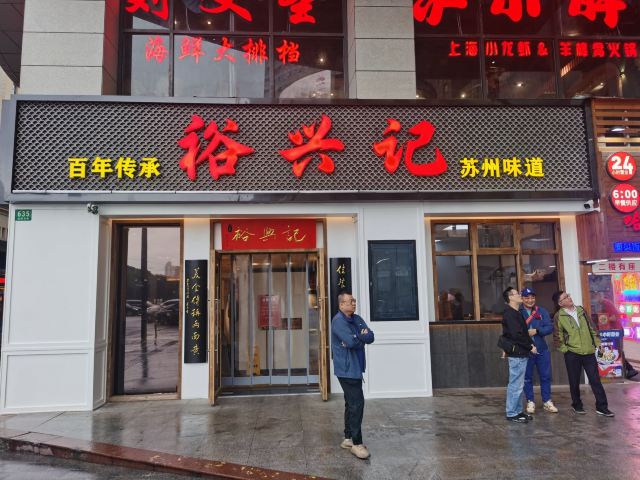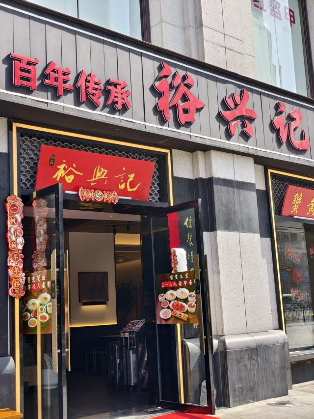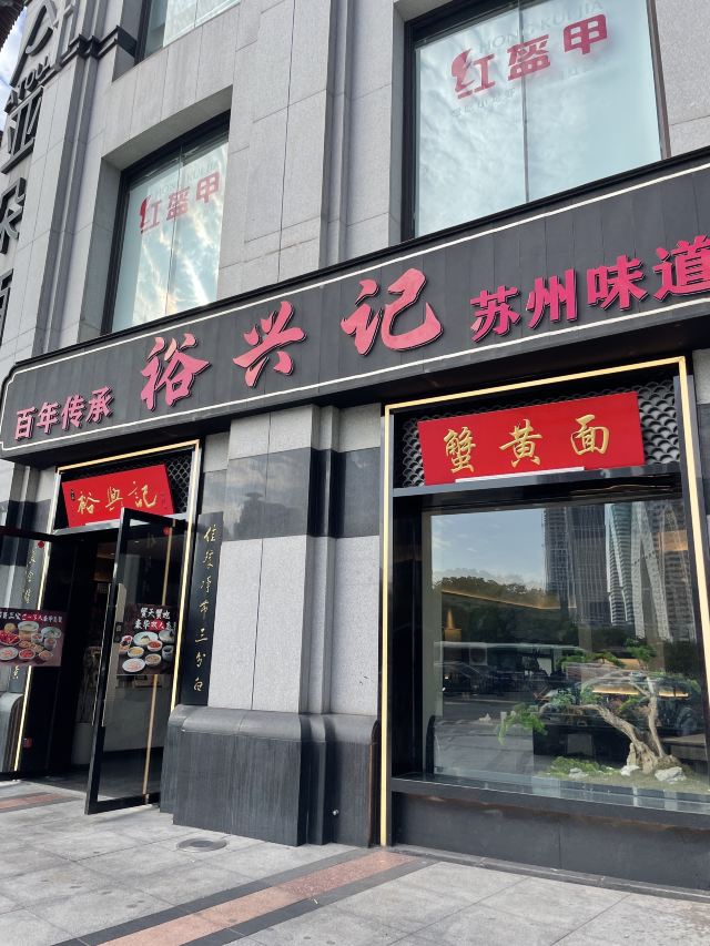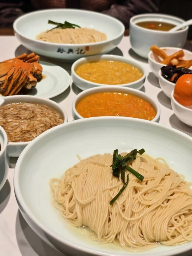 zh70出了青年会,没走几步,便瞧见裕兴记的大红招牌。这家百年老店,是苏州苏式面点的老标杆了,透着股江南的稳妥劲儿。苏式面馆的精髓,大抵在汤头、面条和浇头三样上。汤要鲜醇,白汤得清澈却味厚,绝不用味精提鲜;面条多用细如发丝的银丝面,柔韧弹牙,久泡不烂,好吸足汤汁;浇头讲究不时不食,现炒现做,新鲜得很。走进店里,装修融了苏式园林的雅致和现代简约,木雕花窗,青瓦白墙,氛围温温馨馨的,叫人舒坦。 为图个方便,我们点了蟹天蟹地全蟹宴套餐。这算是店里的招牌,能把蟹的精华汇成一碗。蟹黄、蟹膏、蟹肉全齐了,秃黄油混着蟹粉蟹柳,满满当当地分放在几只小碟里,和一碗银丝面一道端上来。浇头都是店里师傅手工拆的,图个新鲜。拌面也有意思:服务员将几只碟里的精华匀匀地倾入面中,手里筷子轻快地拌着,让每根面条都裹上金黄,拌好了,才含笑问一句:“要加些醋么?”醋一点,风味便活泛起来,酸甜衬着咸鲜。面是可以免费续的,还配三样清爽小菜,一盅菌皇汤。若觉腻,讨杯姜茶或菊花茶,也就舒坦了。 不管是被百年老店的名头吸引,还是专为这蟹天蟹地的鲜美而来,这儿总能给一场地道的苏式面食体验。如今打卡收藏,还能得个设计别致的冰箱贴和一份带奶皮的小酸奶,算是意外之喜。隔桌传来几句粤语,倒叫人想起,这一碗面不单是一餐饭,更像一段江南时令、匠心与美味的叙事了。吃这寸口寸金的蟹面,原味的咸鲜直白热烈,加了醋则另有一番爽口的酸甜。只是有点小遗憾:面条总不够滚烫(蟹家大院也好,寄畅园也罢,待到裕兴记也是一样),拌蟹黄蟹膏时便少了些扑鼻的香气。若面能热腾腾的,这一口下去,怕是更扣住魂儿了。