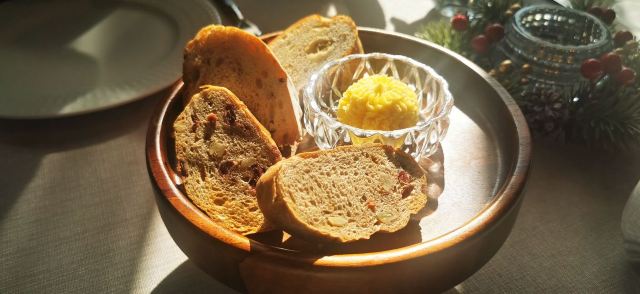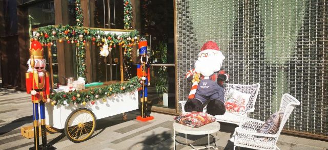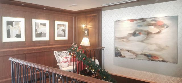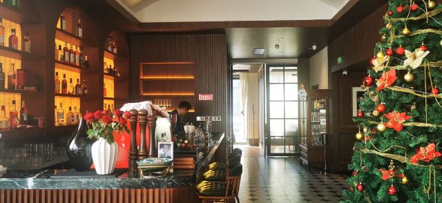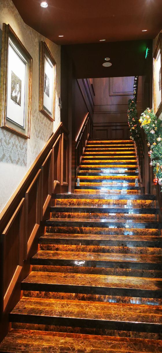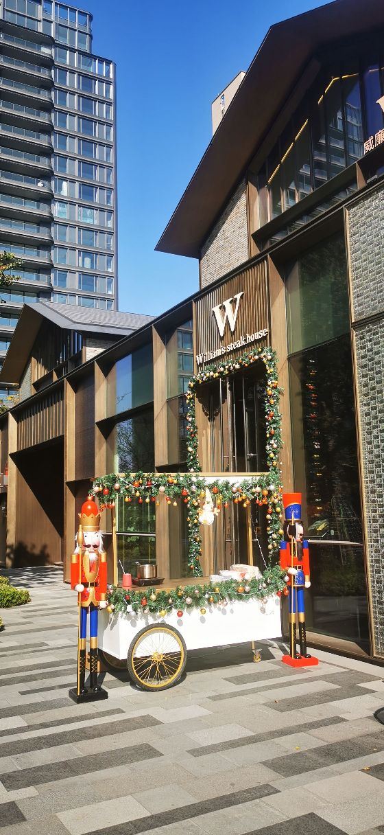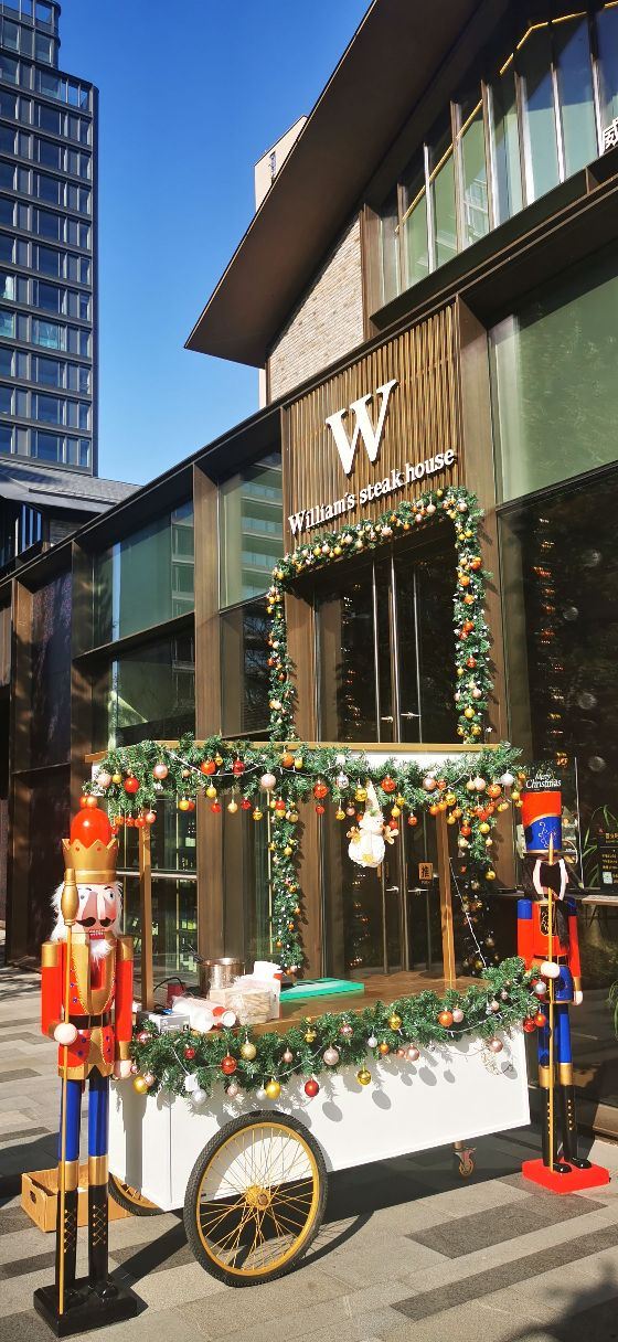 泡泡龙他爸William威廉姆牛排馆,之前听说在衡山路上有一家分店,但具体情况不清楚。这次受邀到西岸中环的这家William一起吃个午饭,这地点交通不方便,没车几乎没法来,离地铁站的距离太远了。这里实际上是商住楼的裙楼,地下车库就是属于商住楼的,空间不大,下去要转好几个弯才找到适当位置停车。还好电梯一上地面出来,就看到了牛排馆。圣诞前后,牛排馆门口站着的是胡桃夹子卫兵,色彩真漂亮。中午生意一般般,到的早我们是第一拨。到二楼,楼梯亮闪闪的很上照。二楼空间大,还有室外露天阳台,春秋天来坐坐不错,还可以远望楼下的旧火车站,远处的星空美术馆、火车头和车厢,还有黄浦江