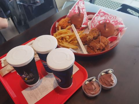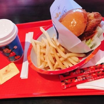 meteorakira在迪士尼里面觅食,这家就在明日世界里头,坐完创极速光轮出来就是啦,餐厅里面主要都是一些快餐,我们点了「韩式猪肉汉堡套餐」说实话味道一般般,里面的猪排炸的有点老,薯条也是无功无过,一份套餐将近一百块的样子,性价比不高。