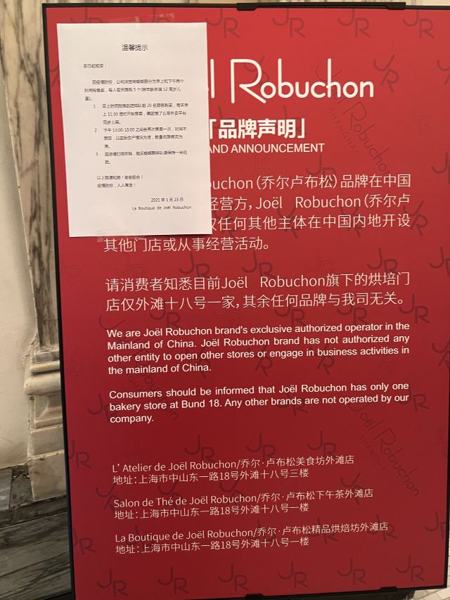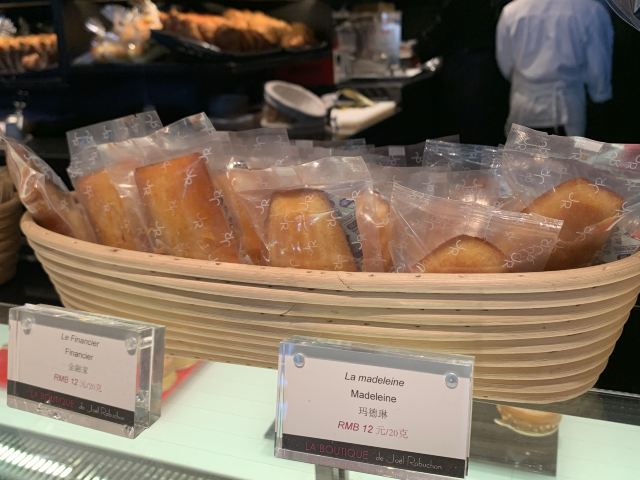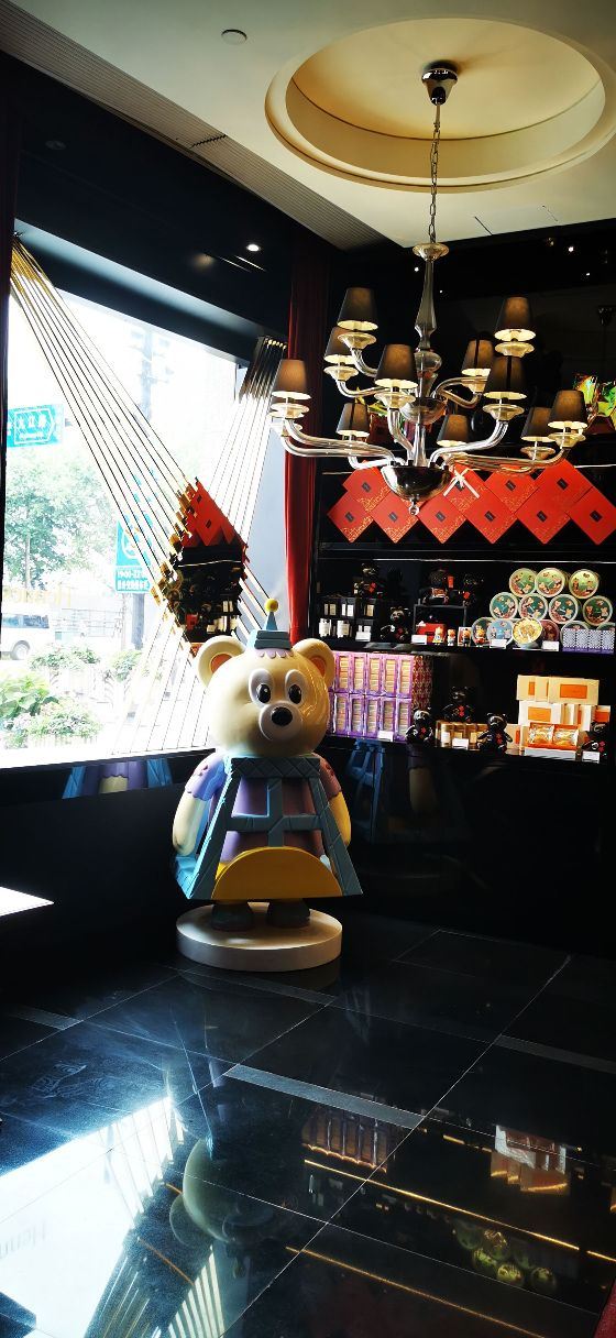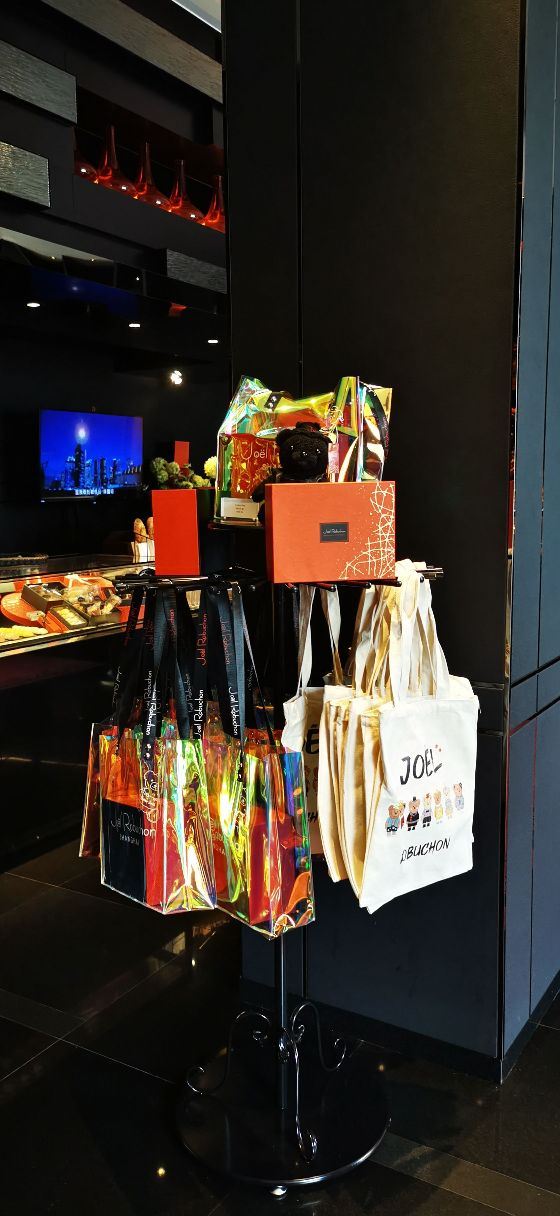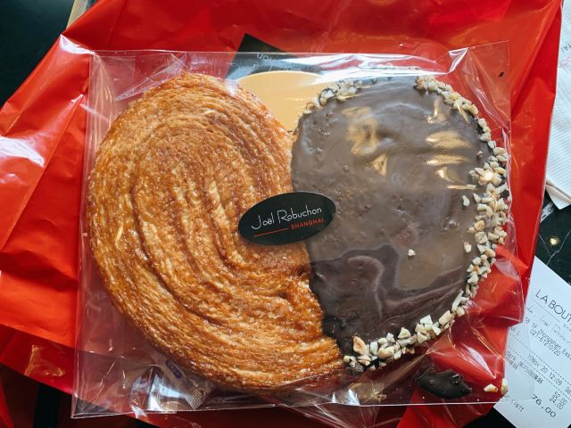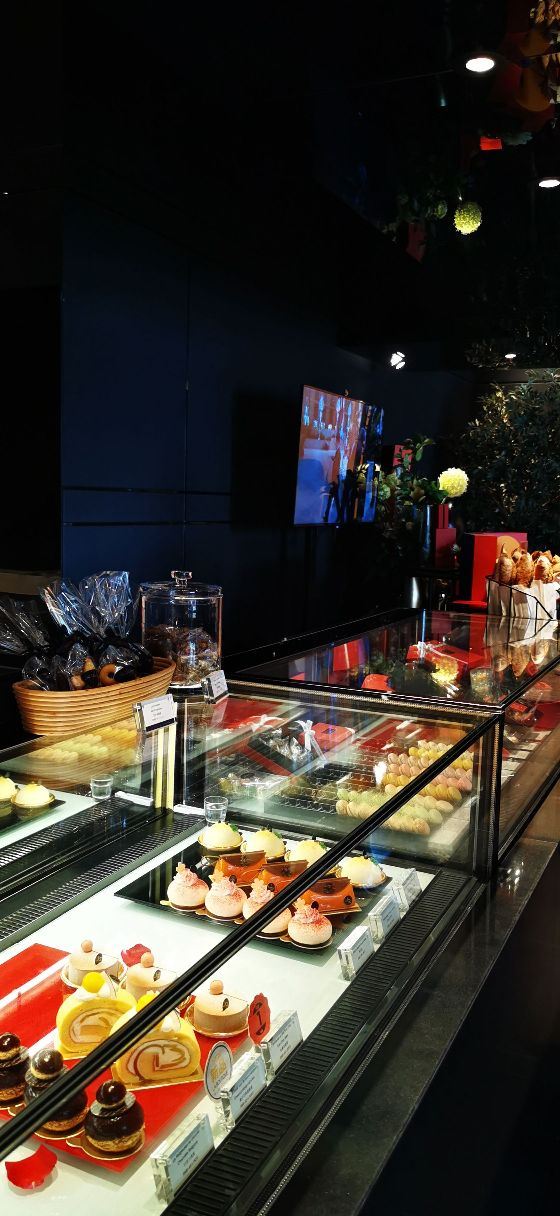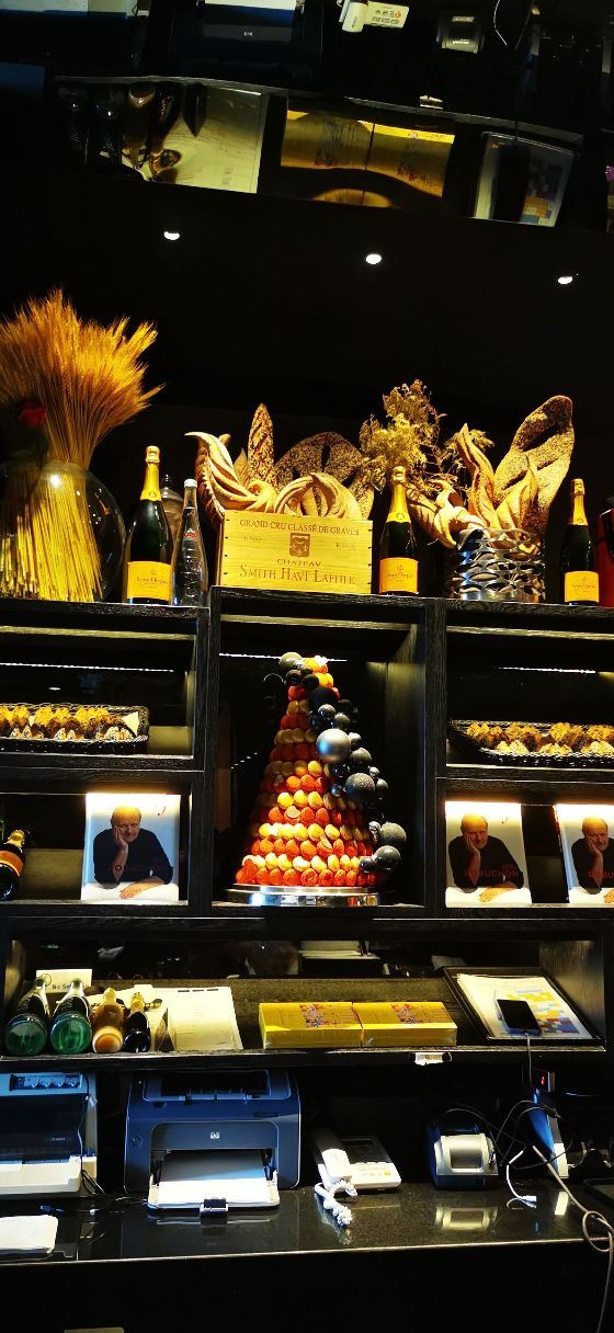 Salon de Thé de Joël Robuchon (Bund 18)这家店占地面积不小,一楼大堂还有更大的下午茶空间。就是大概我到的时间不对头,没看到有人。店内大红大黑色调浓烈,Robuchon不知为啥翻译成“猴布熊”,这不,一男一女两头“猴布熊”站在店堂里,可爱的。面包、甜品选择多样,特别喜欢他家的柠檬派,虽然有点酸酸,小家伙则更钟爱那些蛋糕,例如歌剧院之类;马卡龙选择也多,怕太甜没有尝试过。总体感觉是家相当不错的西式甜品面包铺,价格还在可以接受的范围,没有贵的太过分离谱,发票是纸质的,开起来速度稍微慢一点