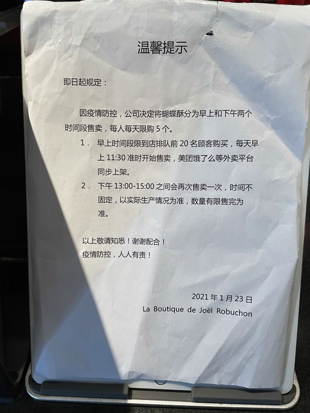 Anna Hsieh最近炒红的蝴蝶酥 11点开卖12点是巅峰1点后 巧克力蝴蝶酥就卖光了 剩下原味蝴蝶酥 至少比另一家店好啊 另一家店基本上开卖就抢光 外滩店还是准备的比较多 一人限购5个 「巧克力蝴蝶酥」 巧克力非常浓郁 真的给蝴蝶酥添加了不同的风味跟口感 「原味蝴蝶酥」 有点硬但是这个硬度是来自焦糖!! (但是比较不会碎) 蝴蝶酥真的很酥脆 奶油香带点微甜 真的不会过甜 这点很棒 「布列塔尼奶油酥」 这款也是经典!! 焦糖厚但是不会过甜 这点真的很推荐 真正好吃的奶油酥除了焦糖口感还要有十足奶油香气才对!! 客人都是打包没有人会堂食 毕竟太多人排队都挤满店里了 会不断回购 不愧是米其林餐厅的面包真的很棒