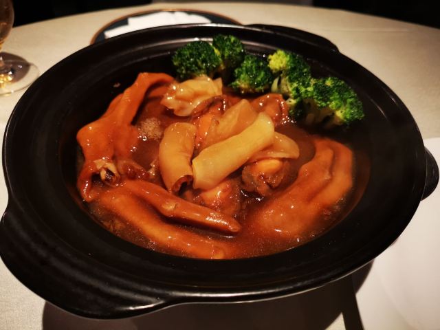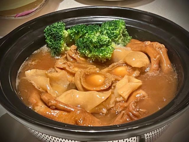 D了个Y食在这里# 来时尚有余位 走上座无虚席 食客年龄层普遍较高 绝对都是会享受 懂美食的食客 老客户居多 不是花里胡哨的网红餐厅 独以口味牢牢抓住食客的胃 |皇朝一品煲^主打菜 必点款 用料实在 小火慢炖 软 糯 香 醇 鲍鱼肉质Q弹 鹅掌酥软可口 鲍汁粘唇 食得一口美味 |金蒜胜瓜蒸蚌仔^荤素搭配 配色好 口感佳 蚌仔肉质饱满 鲜香四溢 |葱油蚕豆爆炒极品牛肉粒^极品雪花牛肉粒 完美口感 推荐尝试 |脆皮流沙包^外层酥脆 内里乾坤 小个头的大味道 很棒 Tips 1 餐厅靠窗一侧在外部装修 有网布围着 照明受点影响 好在本来也不是景观位 影响有限 2 没了网红 来者都是食客 氛围不错 3 有代客泊车服务 不过车多路窄 取车时间上得备足余量 4 期间出了点小状况 妥善处理 中规中矩 不做赘述了 希望类似事件可以避免 当然处理的时候也能大气一点