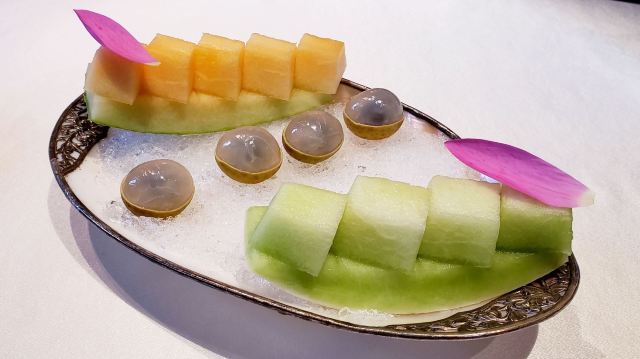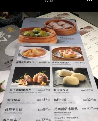脆皮流沙包,黑椒爆炒雪花牛肉粒,香煎鹅肝黑松露带子,皇朝虾饺皇,花胶灌汤饺,香菇黑毛猪烧麦皇,皇朝一品煲,鲍汁凤爪,杨枝甘露,苏格兰蓝龙虾捞面,烧饼,泡椒蒸深海红东星斑
