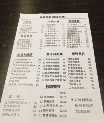 生蚵油条饭(微辣),珍珠奶茶,焦糖杏仁冰砖,咸酥鸡,炸物拼盘,台灣鳳梨冰茶,甘梅地瓜條,台灣香腸滷肉飯,盐酥鸡,烤明太子鲜鱿鱼,豆鼓生蚵油條飯,龍蝦三名治,豆豉生蚵油条饭,酥炸牡蠣,脆皮雞腿排,明太子炒鸡蛋三明治,炸鸡排,九層塔煎蛋,龍蝦生菜沙拉,奶盖奶茶,酥炸花枝丸,麻油鸡,焗烤咖哩牛肉飯,黑椒黃油牛肉飯,豆瓣鱼,龙虾色拉