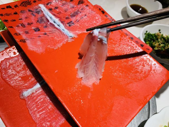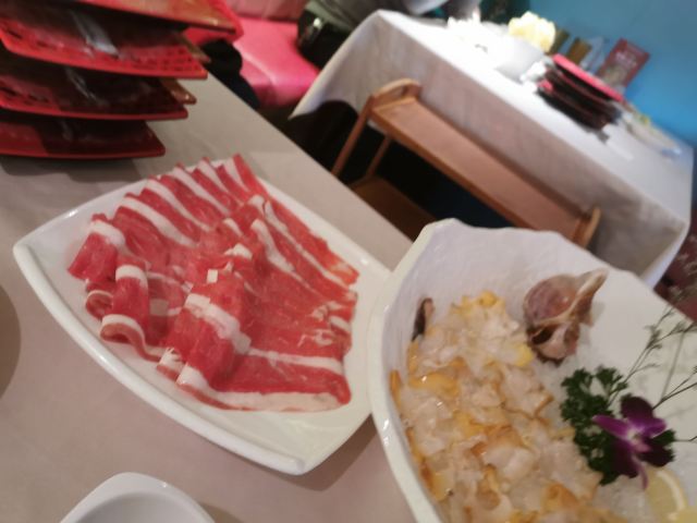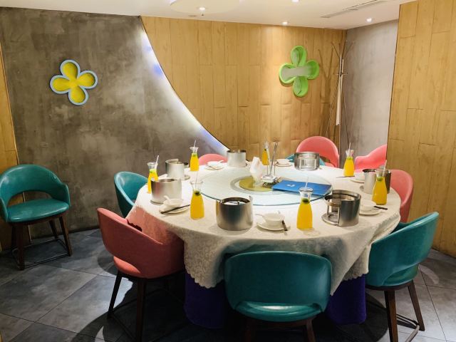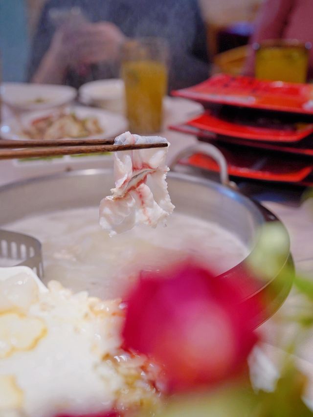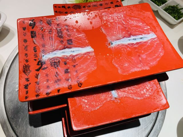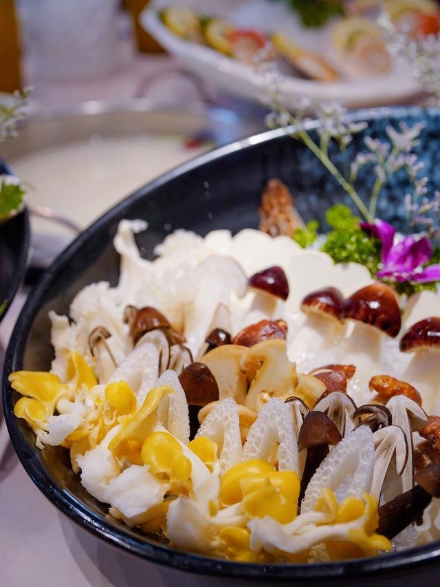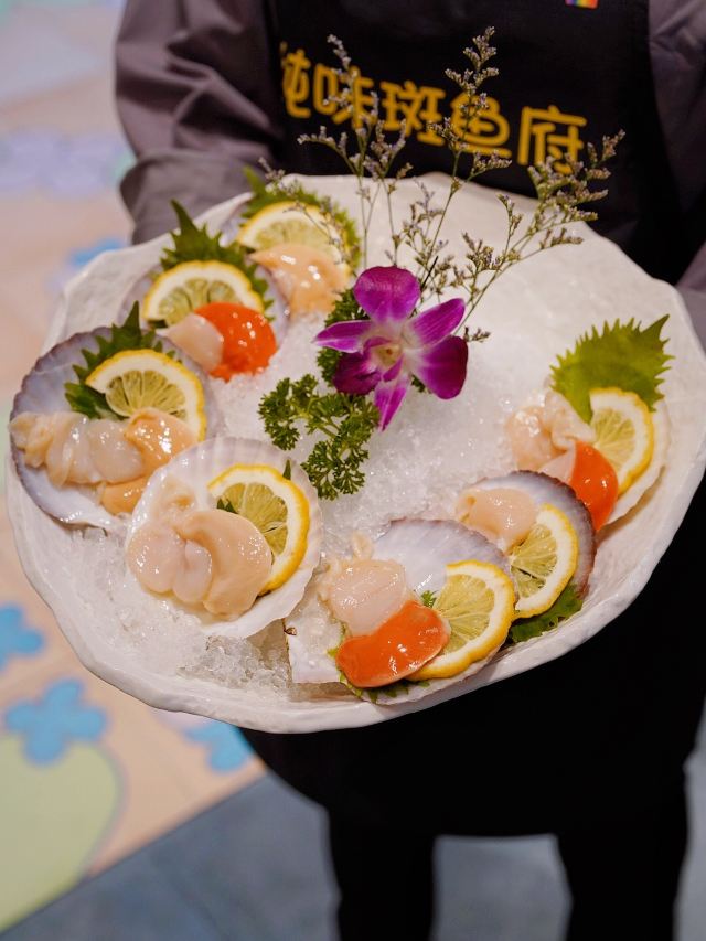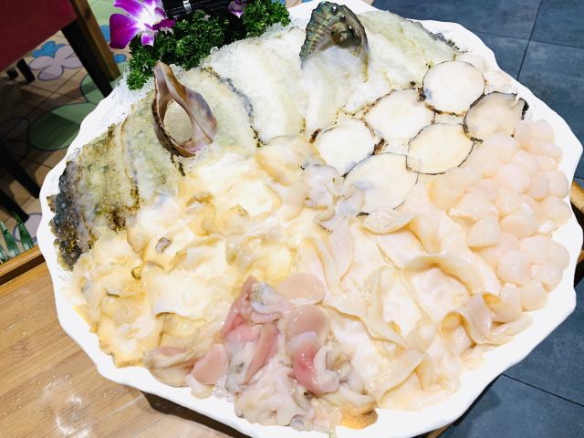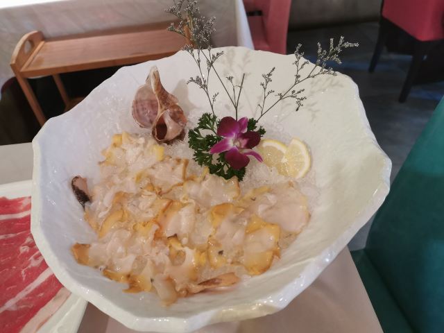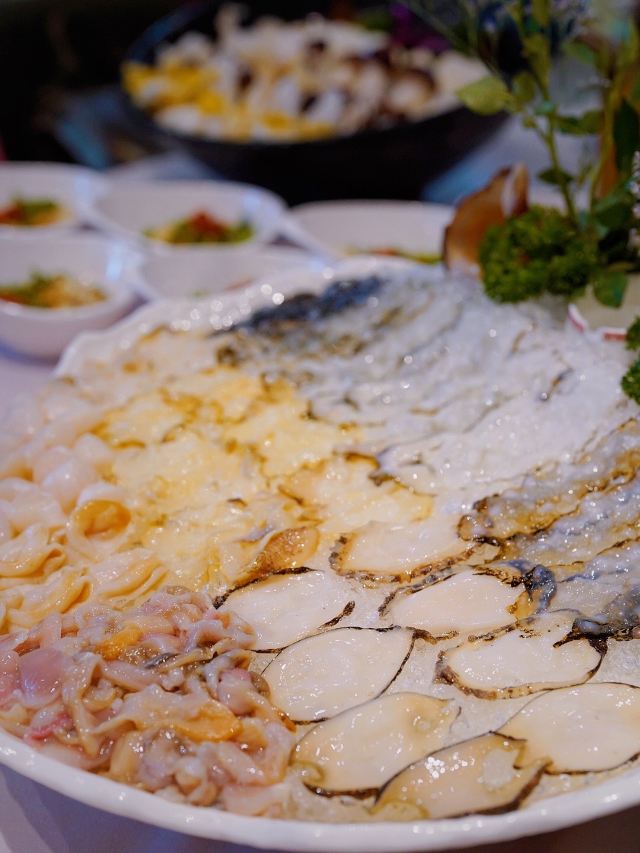 咕噜cloro纯味斑鱼府宝山店,位于宝山万达广场附近,地铁共康路站下来走几步就是~ 店内布置是郁郁葱葱的森林绿为基调~ 大冬天最适合三五好友围炉吃锅,开吃鱼锅不长肉啊[调皮] 凉菜 爽脆鱼皮,一道刚前上个月在广州吃到过的菜肴,没想到上海也有了,虽欠点火候,但味道还行! 莴笋蜇皮,清新爽口,赞[强] 涮锅主打震撼上架 生猛海鲜拼盘,鲍鱼,海螺,干贝丁,活海参,天鹅蛋,鸟贝,依次有不同的入锅涮涮时间,分为5秒,10秒,15秒,1分钟,吃的时候是默念倒数3秒,吃完傻傻分不清,谁是谁的几秒[笑哭][笑哭] 招牌斑鱼片,薄如蝉翼,一碟2片,一碟又一碟,都不知道吃了多少碟[笑脸]好过瘾! 大海虾,每只都超大,肉质粗旷型~ 上品肥牛,一筷子下去,好大一片,入锅涮几下就能吃[调皮] 野生菌拼盘,菌菇类大集合,有松茸菌,鸡油黄菌,牛肝菌,鸡纵菌,绣球菌,竹荪等,第一次看到嫩黄嫩黄的鸡油黄菌,算是长见识了[笑哭]而且下锅后嫩黄色的鸡油黄菌立马变成了白色,真的是神奇的存在[呲牙] 以上有兴趣的小伙伴可以趁着天还冷,锅还暖,速速去吃吧!