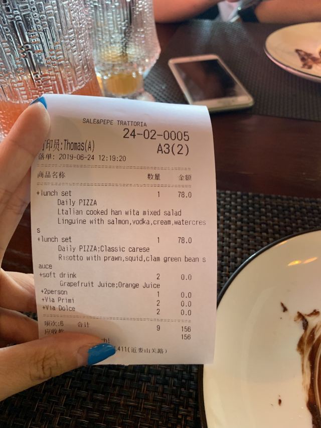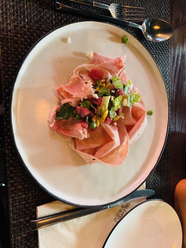 中午和老公来个难得的二人世界,想想去吃啥。我说去食索吧,一直想去吃一直没吃来着。 然后摸索着找到店才发现原来我在三年前来过,坐在同样的位置上,看到了那个同样为我们服务的外国人,有意思。 午市有套餐 前菜我选了火腿配小沙拉,主食是意大利扁面,软饮是西柚汁。 披萨是每天制定的一人一片,还有令人期待的甜品,吃的超满足。