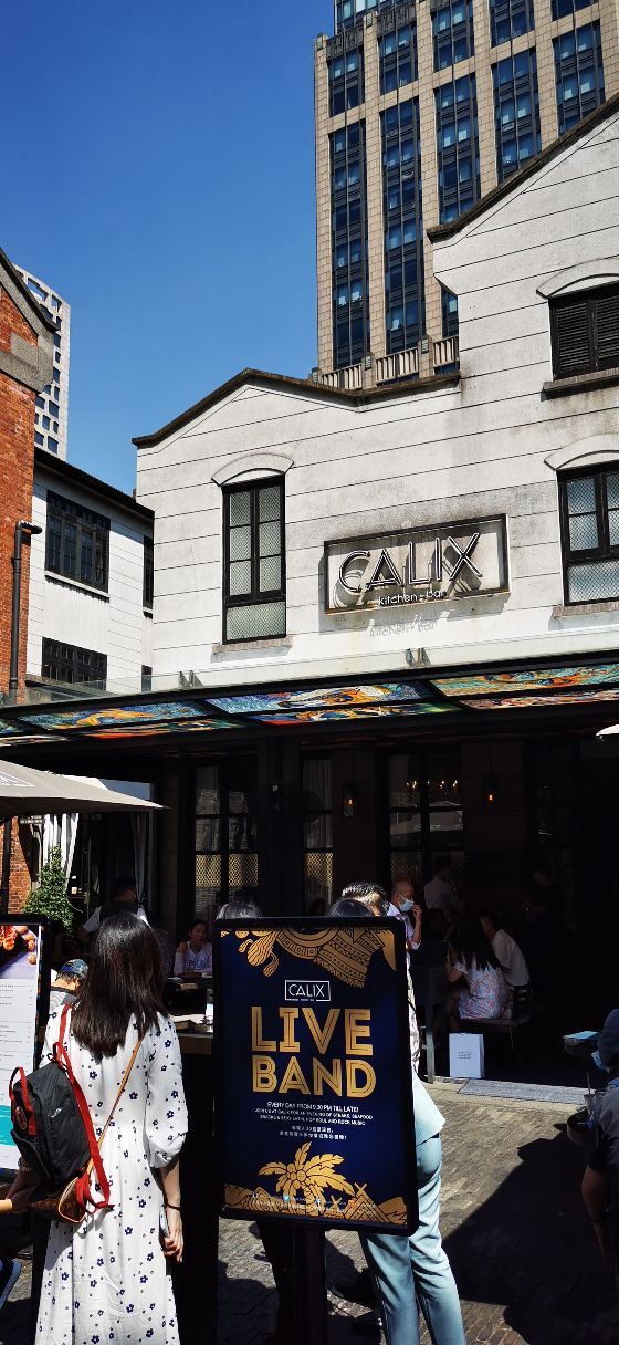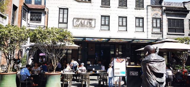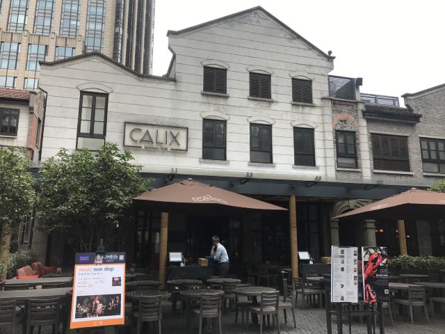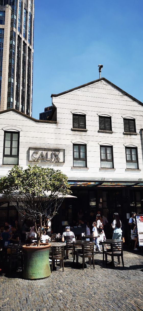 泡泡龙他爸国庆节假日,去看往父亲这边仅存的长辈孃孃,一起外出吃个饭,孃孃提出要顺便看看以前天和里老房子的地方,那就新天地吃饭吧,湖滨地下停车场的入口就在原来天和里酱油店位置的对面,离以前弄堂口的煤球厂也仅是几步之遥。吃什么也是个问题,新天地适合的中餐馆本来就不多,年纪大的还不能吃辣,突然想起来孃孃是圣约翰毕业的,虽然九十多了,但吃个西餐绝对没问题,而且还一定要喝咖啡,那就CALIX吧。这家刚开张的时候来过,那时整个新天地到处都是CALIX的小旗广告,还有西班牙吉他大师的表演,后来就没再去过。这次路上倒顺利,提前半小时餐厅就来电话再次确认,到门口看了一下,室外空间大但天气有点热,也怕有人抽烟严重污染空气,一楼略感压抑,就上了二楼。没想到二楼除了开放式的厨房外,还有两个包房,都可以坐8个人左右,一个是长桌,一个是圆桌。吃西餐当然要长桌,桌子面积也大,摊得开