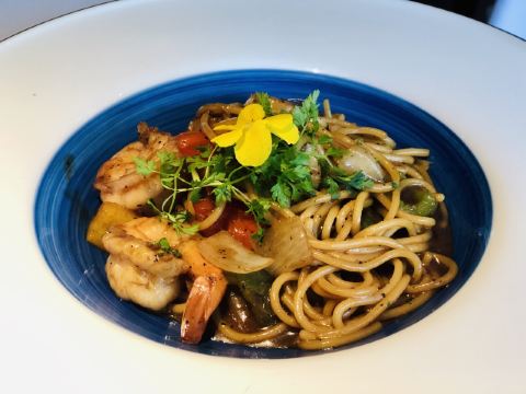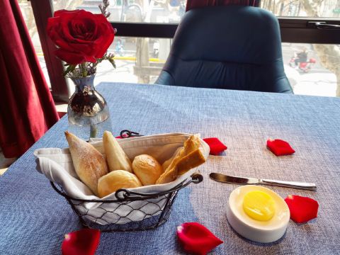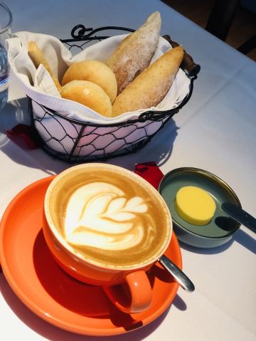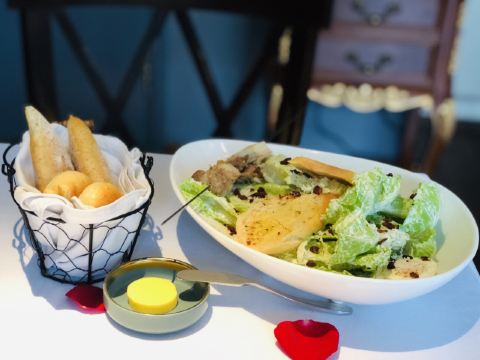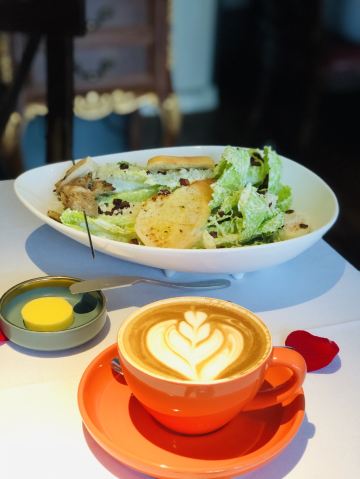 桃桃淘丽丝思南公馆附近的西餐厅🍴,入口就在复兴中路上,不过不太起眼,生意非常的不错,周末中午全部坐满了,还好里面的小白楼也是它家的,没有等位,被安排到那里入座了😄 小鲜肉服务生颜值满高的,服务也挺专业,每桌都送餐前面包和黄油🧈,我只拍了照片没有享用,因为吃了这个,后面的主食怎么还吃得下啊 咖啡上的最早,拉花漂亮的,口感不来塞,奶味有点怪怪的,只喝了半杯.... 凯撒色拉🥗的量巨大,还有鸡肉烤串🍢,不过里面蔬菜都是整片叶子,吃起来药刀叉并用,有点切累啊; 主食点了份黑胡椒海鲜意面🍝,摆盘nice,鲜嫩Q弹的凤尾虾、味道蛮好,分量对我来说刚刚好,男生肯定是不够滴; 每桌都有玫瑰花瓣的点缀,非常适合约会