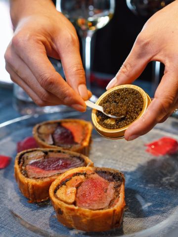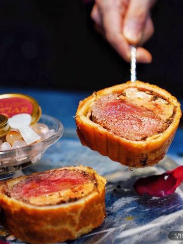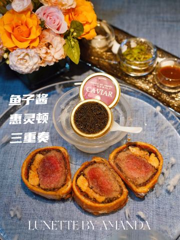 加油干饭呀纵观惠林顿牛排排行榜,常年霸榜第一的弦月窗LUNETTE BY AMANDA,五周年庆推出重磅新品,首创鱼子酱惠灵顿三重奏,带你解锁牛排的隐藏吃法🔓 ❤️第一重,品尝原汁原味 500天谷饲和牛牛柳、鹅肝、蘑菇松露酱、帕尔玛火腿和金黄酥皮交融一体,复合鲜香层次丰富。 🧡第二重,海盐锦上添花 在鱼子酱出现之前,海盐一直都是牛排的最佳CP,淡妆浓抹总相宜 💛第三重,鱼子酱升华,弦月窗招牌和牛惠灵顿牛排➕定制西伯利亚鲟鱼子酱,选用饲养十年以上的西伯利亚鲟鱼卵,成色透亮犹如黑玛瑙一般,入口伴随浓郁奶香回味悠长,简直就是量身定制的黄金拍档。 原来,自制餐前面包不只可以用来配黄油,蘸上黑松露温泉蛋也是意外好吃!还有西班牙伊比利亚火腿提味增鲜,绝绝子💯 入秋以后,除了南瓜汤、海鲜汤和松茸蘑菇汤以外,又多了一道养生新选择,🌰栗子浓汤佐节瓜丁🌰乍看跟蘑菇汤没差,入口有种在喝秋天第一杯栗子奶茶的幸福感,其中栗子薄片吃起来则有种马蹄的爽脆。 香煎虎头虾佐米型面,虎头虎煎大虾鲜香四溢,似米非米的意面富有嚼劲。 饭后甜品也是颜值担当,法式蜜桃心形茉莉花慕斯,吃一口甜品也是爱你的形状❤️
