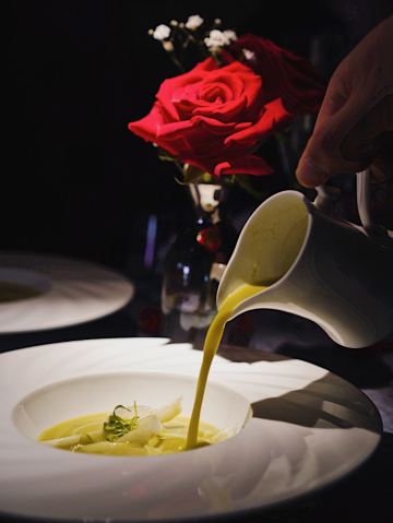 加油干饭呀惠灵顿牛排榜第一的弦月窗🌹春季上新啦❣️ 五一假期情调约会圣地,弦月窗必须拥有姓名!每张桌子上都撒满玫瑰花瓣,夜晚点亮烛台仪式感满分,浪漫满分的用餐环境,绝对是颜控收割机。 🌹一年一度的魔都露台季,在春意盎然的露台上享用丰盛大餐,真是大写的心旷神怡 🪟店里还有定制排酸柜,一整排干式熟成柜绝对是顶级牛排馆配置,后厨直接从柜中取材,高品质肉眼新鲜看得见 🐟香煎深海沙丁鱼佐地中海风味番茄汁🍅 将北欧深海纯净海域沙丁鱼高温煎烤,而后浇淋清新微酸的地中海风味番茄酱汁, 🥗芦笋浓汤佐开心果&青豆🥗 时令蔬菜是大自然最好的馈赠,选用当季新鲜芦笋慢火熬制,佐以奶油、黄油和薄荷油调味,还有开心果丰富口感,鲜甜浓郁令人食欲大振。 除了招牌特色的惠灵顿,弦月窗的🥩干式熟成战俘牛排🥩也是相当专业,选用澳洲谷饲400天和牛M6眼肉部位,不低于21天的干式熟成,生肉花纹店员当面现切。 经由烹饪以后,边缘略带焦香中间却依然鲜嫩多汁,每一口都奶香浓郁,佐以喜马拉雅岩盐更是锦上添花。