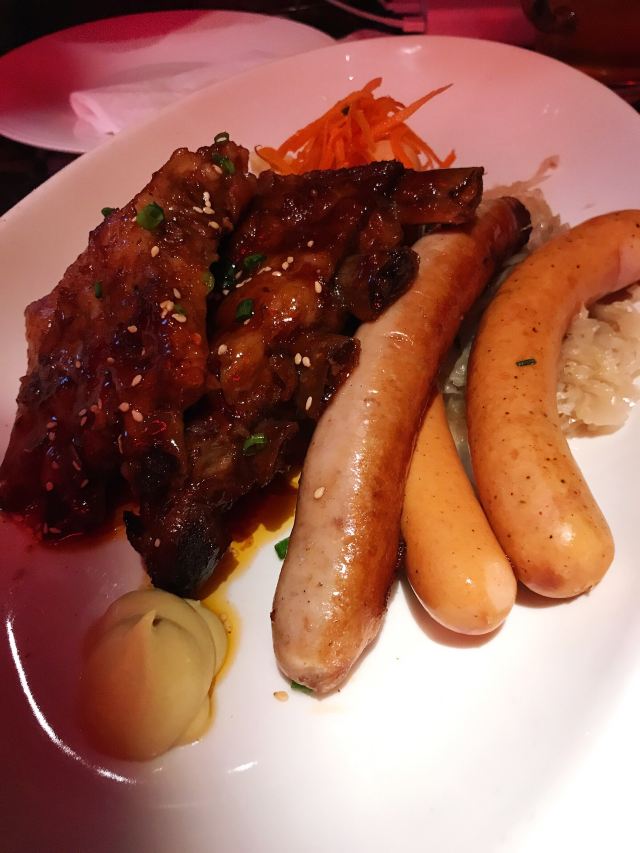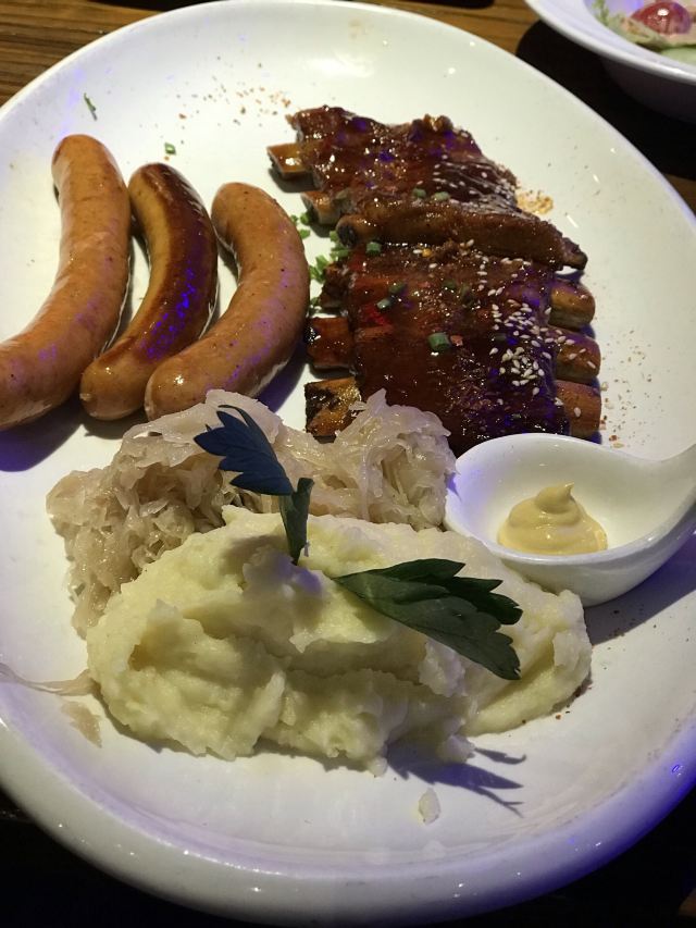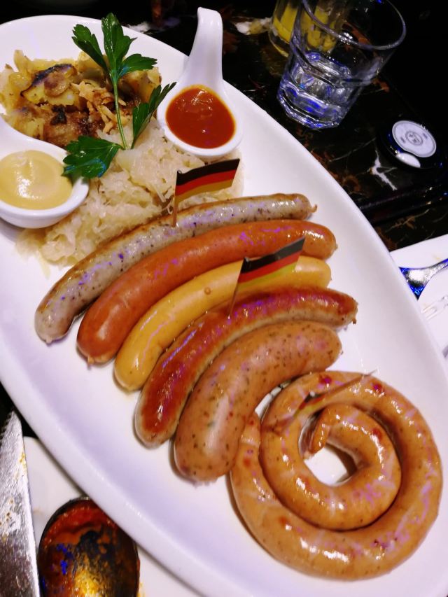 德式香肠拼盘,香肠拼盘,火焰猪肘,巴伐利亚烤猪肘,特色烤猪肋排,雪蟹沙拉,德式烤猪肘,水果什锦火焰披萨,香肠肋排土豆泥酸菜,奶油土豆泥,火焰披萨,小沙拉,鳕鱼,德式烤肠,水果披萨,德国沃森啤酒,牛油果橙子大虾沙拉,炸薯条,澳洲牛眼肉,自酿黑啤,自酿黄啤,奶油蘑菇汤,焦糖巧克力布蕾