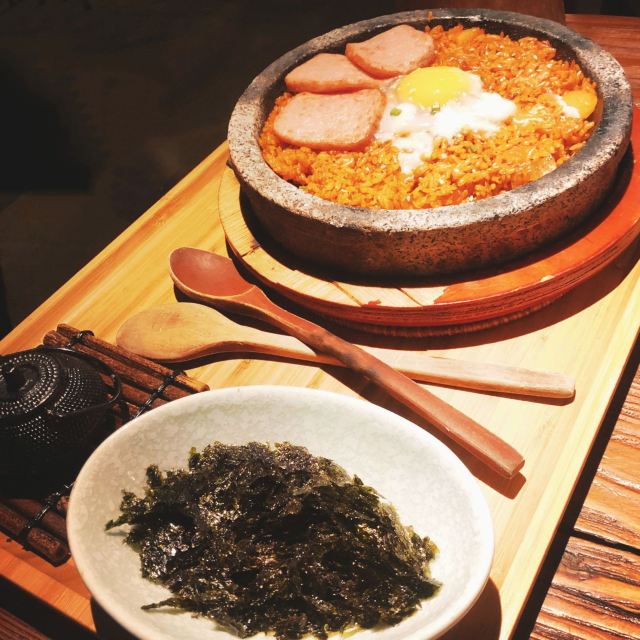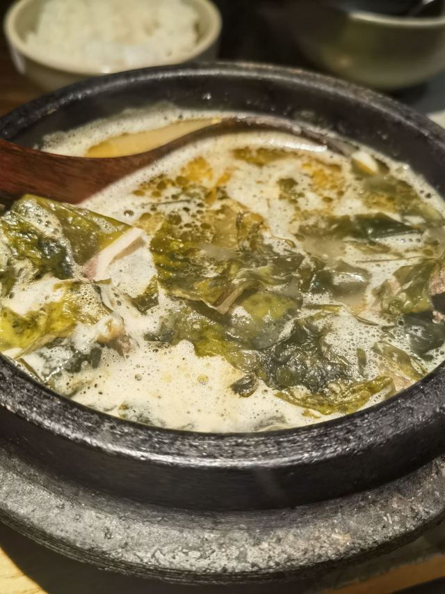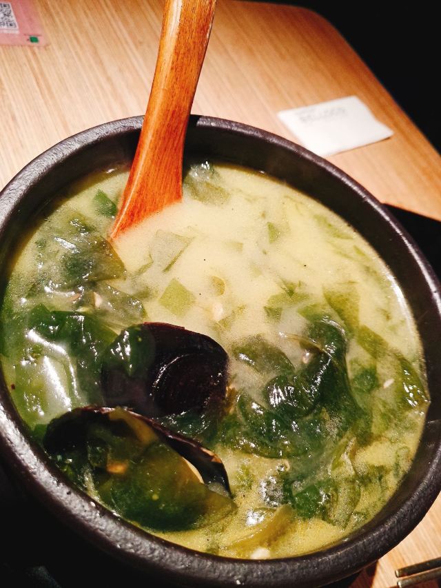 狸狸喵喵本来想吃韩国帅锅现做的提拉米苏,可惜下架了,还好心心念念的其他几道菜味道都满好,安慰一下受伤的小心灵。 黄金南瓜粥第一个上桌,第一口没觉得惊艳,但是接下来的几勺,奶油的浓香慢慢充盈起来,好喝,难怪能占据招牌菜头把交椅。 芝士饭团外皮香脆,也有内涵,剖开饭团里面芝士挺多的。 很喜烤肥牛,嫩嫩的肥牛肉无论是单吃还是拌着酱汁包饼都不错。 青口海带汤料足足的,青口毛估估有十只的样子,海带和平时家里买的不同,是薄薄的,外形象紫菜,但是口感比紫菜软糯。 番茄泡菜五花肉烩饭最后上桌,其实味道不错,但是前面几个菜里基本都带有奶油芝士之类的奶制品,胃口已经有些发腻,所以等到尝烩饭时,口感有些打折扣。