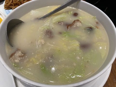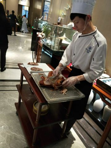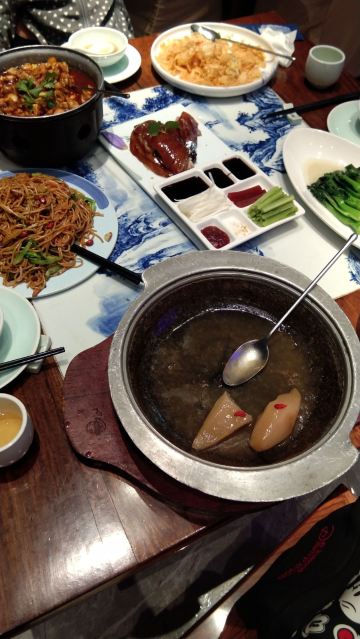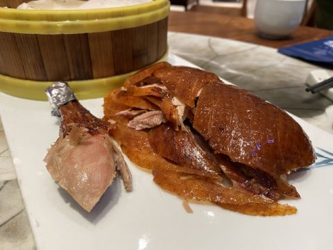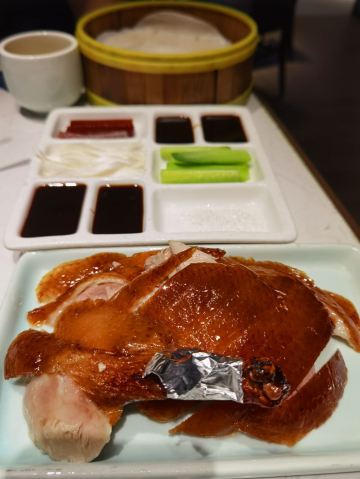 瓷忆离父皇母后家太远,不然有点想法年夜饭就在这家吃了,因为小公主和父皇母后喜欢吃烤鸭,老一辈又喜欢热闹排场,可以把姨妈叔叔(姨夫~从他们恋爱我就叫叔叔改不过口了╯□╰)舅舅舅妈都安排上。 这家烤鸭是明档,你可以完整看到一只生鸭子变熟鸭子的过程,我还挺感兴趣,所以那次吃饭去上了七八次厕所。。。汗😓其实就是去看烤鸭子,但是因为那边有几桌客人的不想我盯着看对他们造成困扰所以我只能走过去再走过来,当然是慢速的。 厨师会给你片好,两大一小半只鸭子足够了,蘸酱包菜卷起来~吃!上汤白萝卜真的鲜,比我全家关东煮那边买的好吃多了。菜心不是很嫩,炒面老大一份。