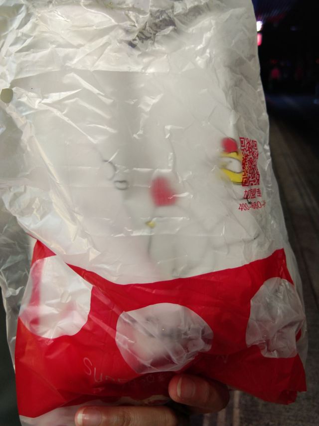 超级鸡车,最贵的那个鸡排已经19元一片了,帮切的所以拍不了比脸还大的照片,看看袋子里装的也还可以看不出和18元或17元的区别,买的是脆皮,隔了10分钟吃的,还有点热,但是不脆了,这个名字起的不符合事实了。
