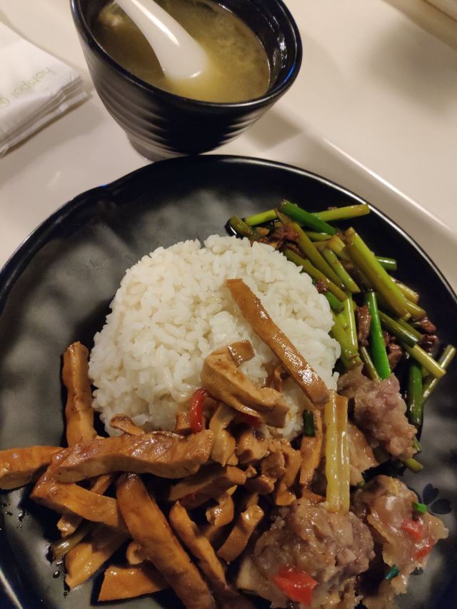 梦大快餐,门面看起来蛮干净舒服的,菜品也价廉物美,量也蛮多的,食客不少。马兰头香干,芹菜肉丝,雪菜豆腐,味道算是正常水平。