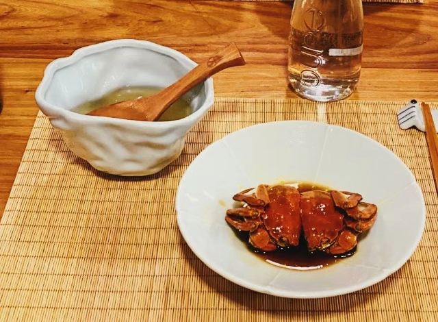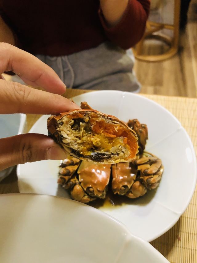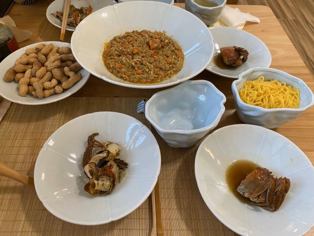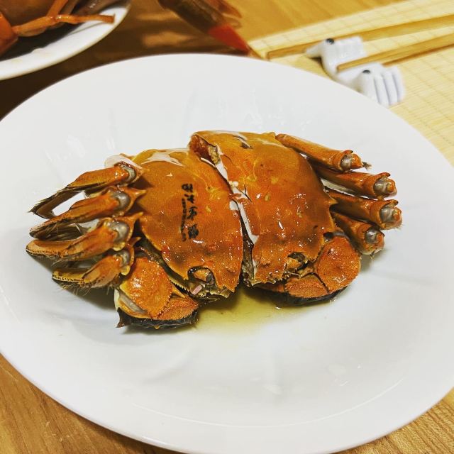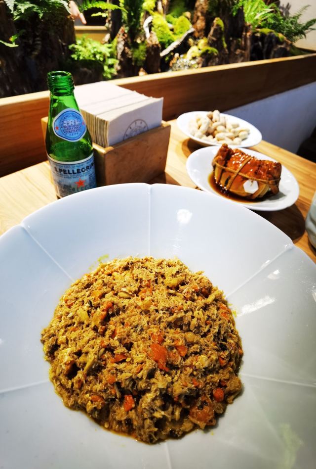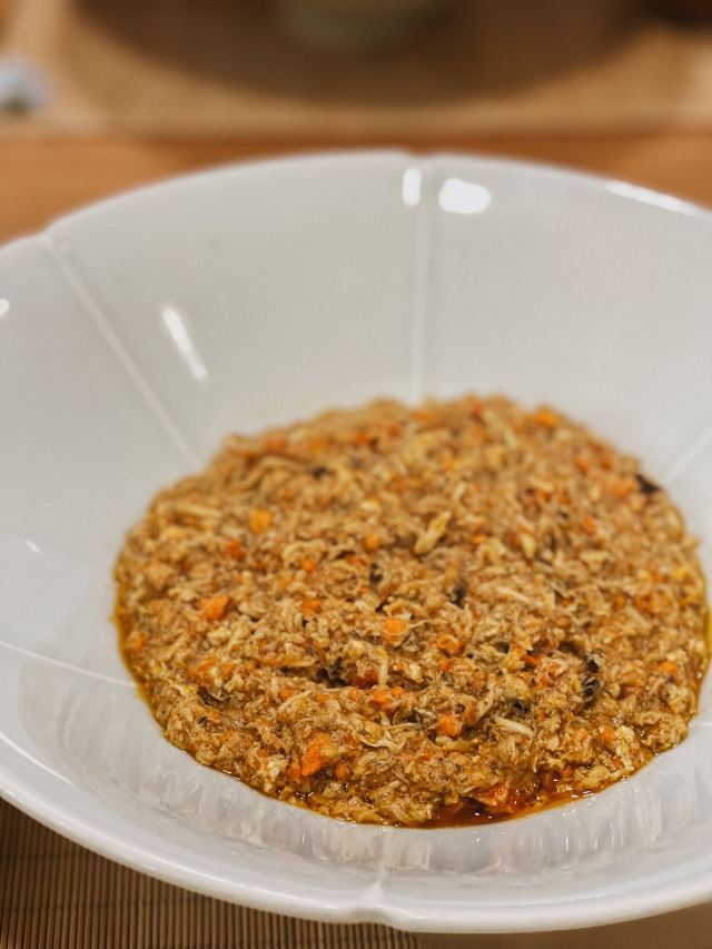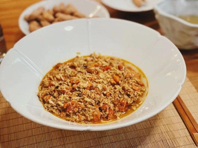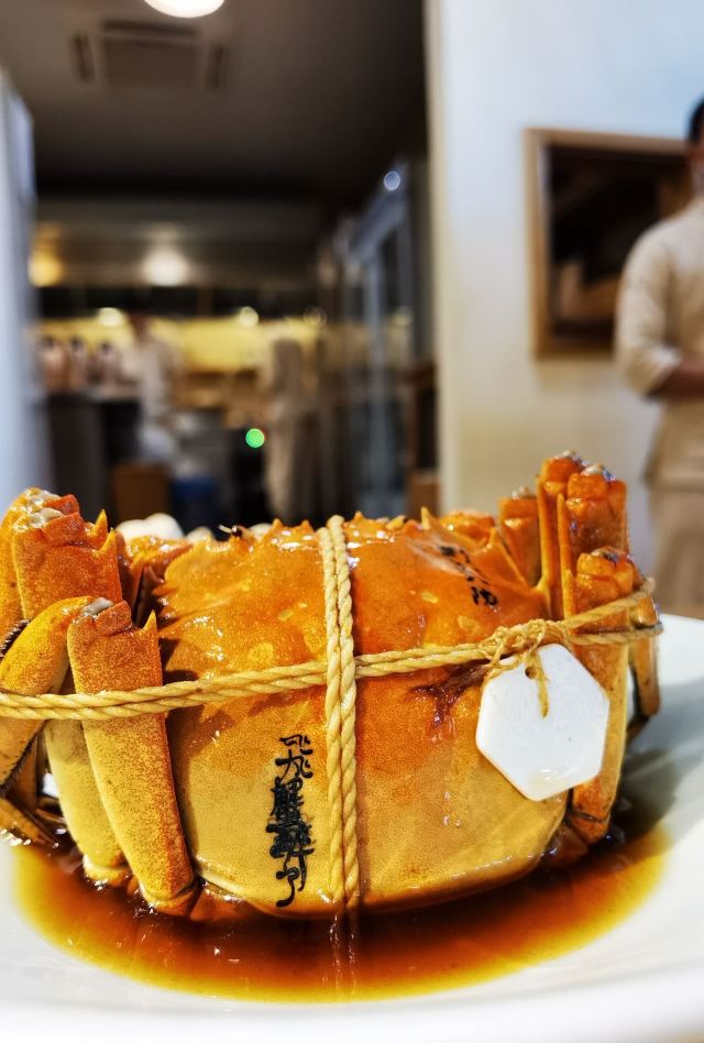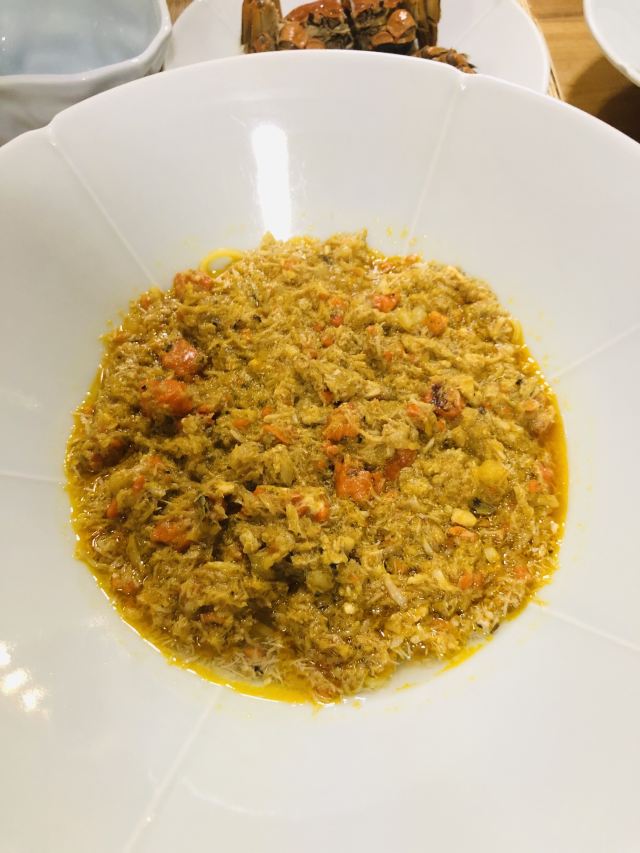 痴痴的饿货这家店收藏了好久,终于在吃蟹的季节去光顾了,建议最好提前预约一下,排队人还不少,大家都是去尝这份鲜的,点了一份蟹肉肉和蟹黄金,粗粗看下差不多,都是满满一大份蟹肉,特别豪气,吃蟹吃出顶配的感觉,区别在于蟹黄金看着金灿灿的都是蟹膏为主,,蟹肉肉以蟹的其他部位为主,稍稍比蟹黄金清淡点,单独吃都不错,满口的蟹香味,不用动手确吃到满足,真的挺爽的体验,但我发现肉肉和黄金拌着在一起才是绝配,解了单吃蟹黄金的油腻感,再拌点醋简直完美了,对女生来说可能稍稍有点偏寒性,一定要喝他们家自制的生姜水暖胃,关键是很好喝,甜甜辣辣的好温暖,而且他们家的饮料也很豪气,依云水都是免费的,还送个小礼物留纪念,喜欢吃螃蟹但不愿意自己动手的可以来试试。