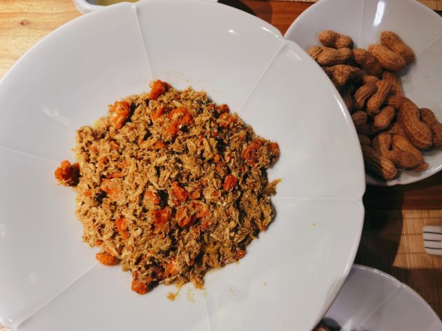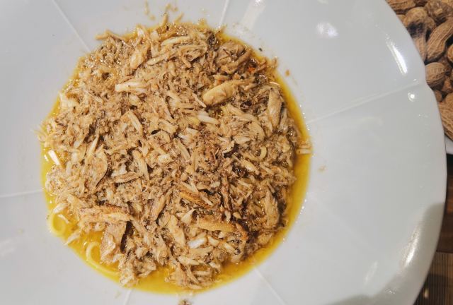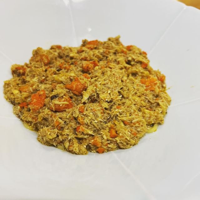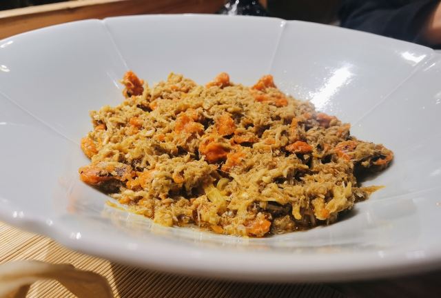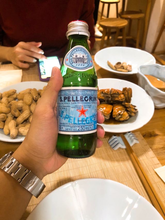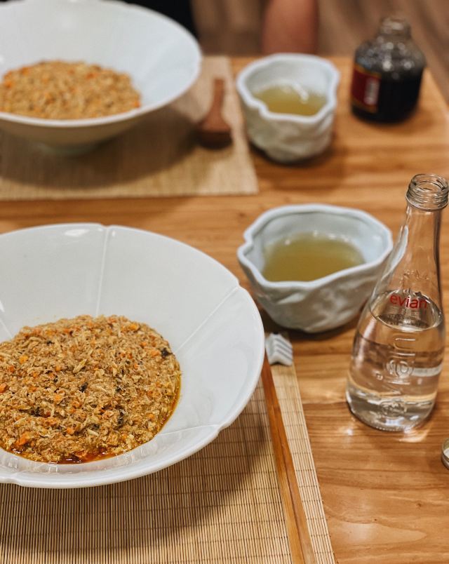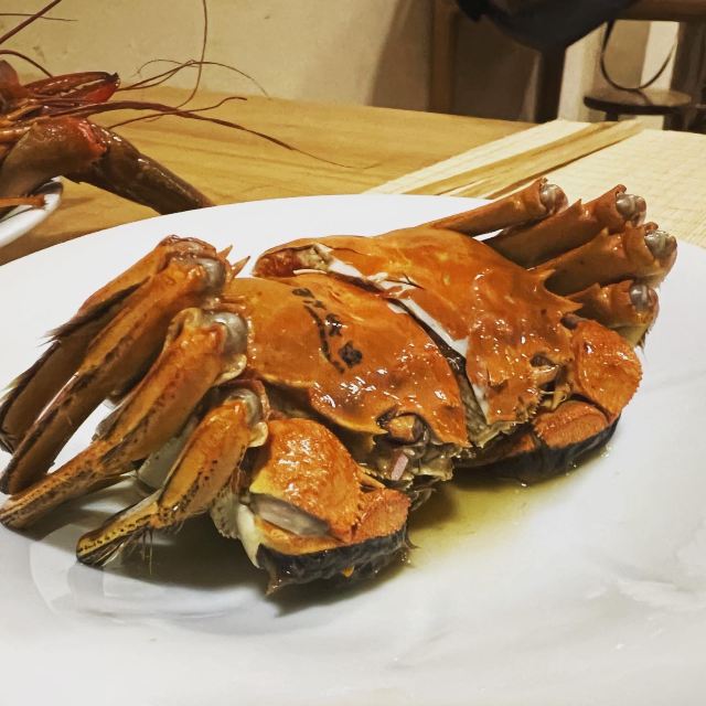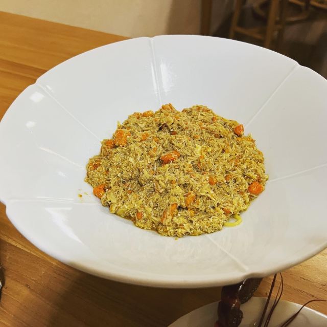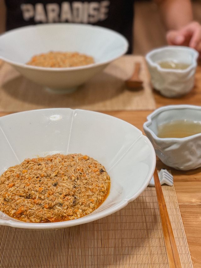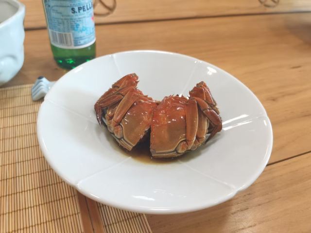 痴痴的饿货这家店收藏了好久,终于在吃蟹的季节去光顾了,建议最好提前预约一下,排队人还不少,大家都是去尝这份鲜的,点了一份蟹肉肉和蟹黄金,粗粗看下差不多,都是满满一大份蟹肉,特别豪气,吃蟹吃出顶配的感觉,区别在于蟹黄金看着金灿灿的都是蟹膏为主,,蟹肉肉以蟹的其他部位为主,稍稍比蟹黄金清淡点,单独吃都不错,满口的蟹香味,不用动手确吃到满足,真的挺爽的体验,但我发现肉肉和黄金拌着在一起才是绝配,解了单吃蟹黄金的油腻感,再拌点醋简直完美了,对女生来说可能稍稍有点偏寒性,一定要喝他们家自制的生姜水暖胃,关键是很好喝,甜甜辣辣的好温暖,而且他们家的饮料也很豪气,依云水都是免费的,还送个小礼物留纪念,喜欢吃螃蟹但不愿意自己动手的可以来试试。