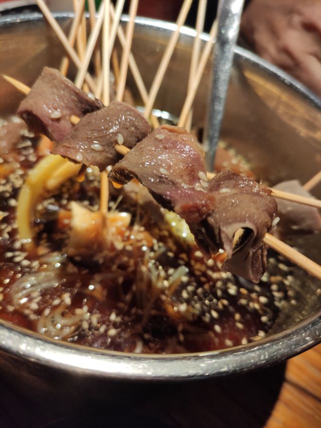 平时吃串串只为快,不过在归蜀第是可以当正餐的。除了串串的可选品多外,这里还有很多四川小吃,每种量都小小的,价格也不贵,所以一次能尝到好几样,个人偏爱甜水面和鸭肠。串串吃多了太辣?好吃的甜品冰粉、凉粉可以搭配,当然最爽还是酸梅汤。