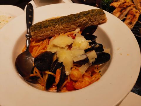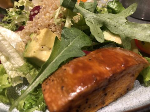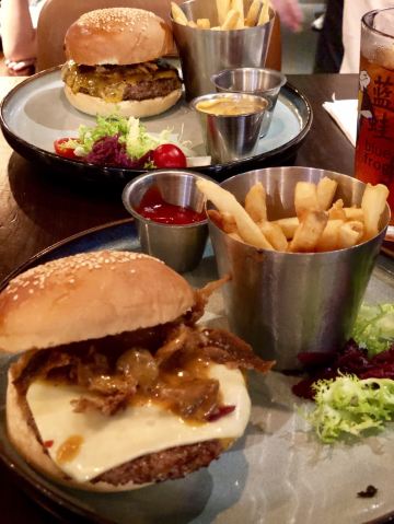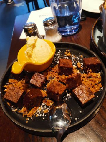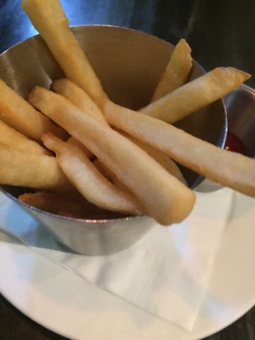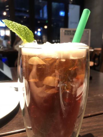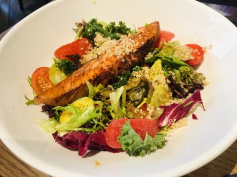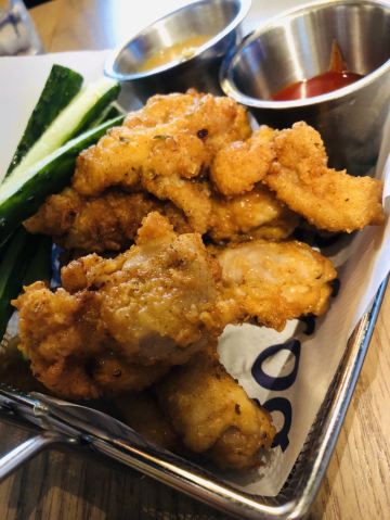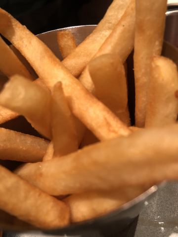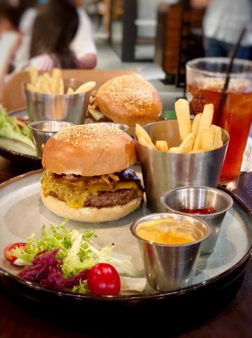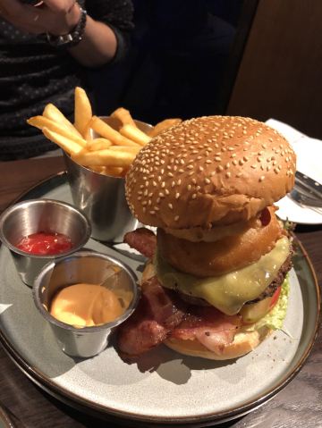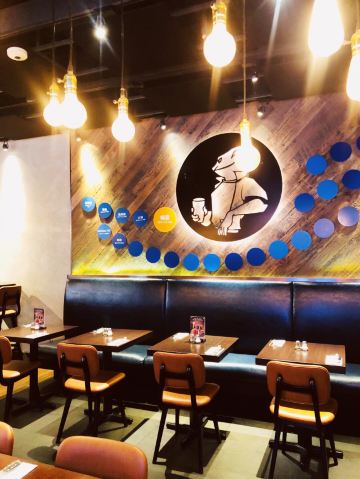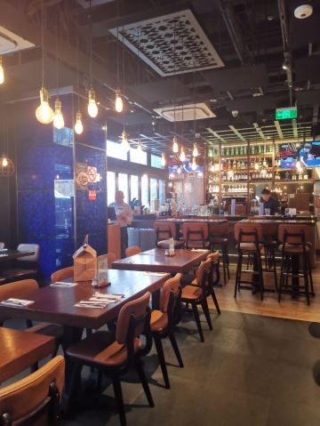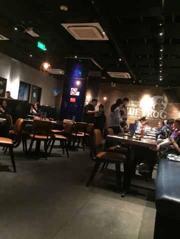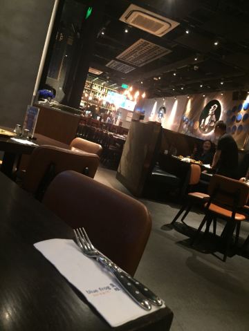 bluefrog蓝蛙 1)店面位置:五角场万达店店位于万达广场B区一层。 2)店面特色:美式餐厅,西餐厅+酒吧模式,主要提供西式餐饮,包括汉堡、配餐、沙拉、各式酒水等。 3)店面环境:有室内座位和户外露天座位,室内有电子屏幕。堂食座位有比较宽敞的沙发座和木质方桌,餐桌上有刀叉、餐巾纸盒、胡椒、盐等调味品。 4)用餐体验:进店入座后有免费茶水。点单后,出单速度较快。 鸡肉凯撒沙拉¥ 78一份,里面有罗马生菜、扒鸡胸肉、蒜香面包丁等,混合凯撒汁和芝士片搅匀后比较入味。 薯条小份30元一小筒配有沙拉酱,薯条外金黄里嫩,趁热吃不算脆,蘸上番茄酱酸酸甜甜刚好。 茶30元一杯,是用祁门红茶茶包泡制的,另外配有一小块法式饼干。把饼干掰碎一小块放入红茶总,然后喝一口红茶配一口饼干可以很好地缓解红茶的涩感,红茶比较香醇。 5)餐饮价格:人均80元左右。