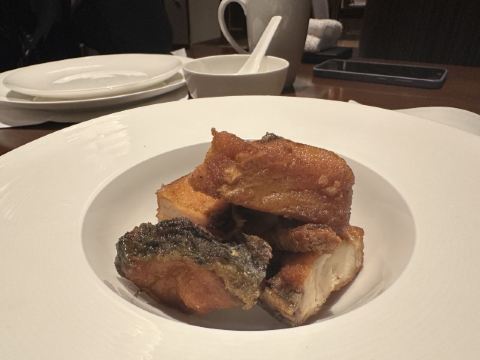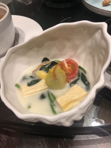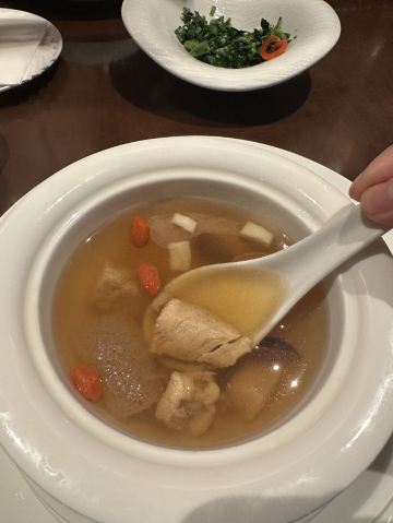 Caifenglou·zhong Restaurant(Guo Jia Hui Zhan Zhong Xin Shang Hai Zhou Ji Dian )深坑的品质,深坑的价格 🌟亮点特色: 餐厅环境:深坑酒店是世界级的品牌,其餐厅也是!彩丰楼是一家粤菜馆,在大堂的楼上,餐厅布置很精致,服务态度很好,预定了两人的小包间,隔断的墙面显得非常有格调,漏空设计风格,金色,令人赏心悦目。菜品口感不错,但是缺乏引起亮目的大菜。现在很多品质餐厅都釆用干冰来营造氛围,建议可以采用一下。 🕙营业时间:11:00–22:00。 🍽美食攻略: 推荐菜品: 1.菌菇竹荪汤:粤菜的餐前经典,以汤养胃,润泽美妙。 2.酱汁牛肉:牛肉品质口感不错,摆盘也精致。 3.煎银鳕鱼:煎炸有点过了。 💰人均消费:500元。 🌟亮点特色: 餐厅总分:餐厅环境优雅大气,菜品味道很不错,服务态度很好。 📌小Tips:一定要提前预约,否则有可能等位。