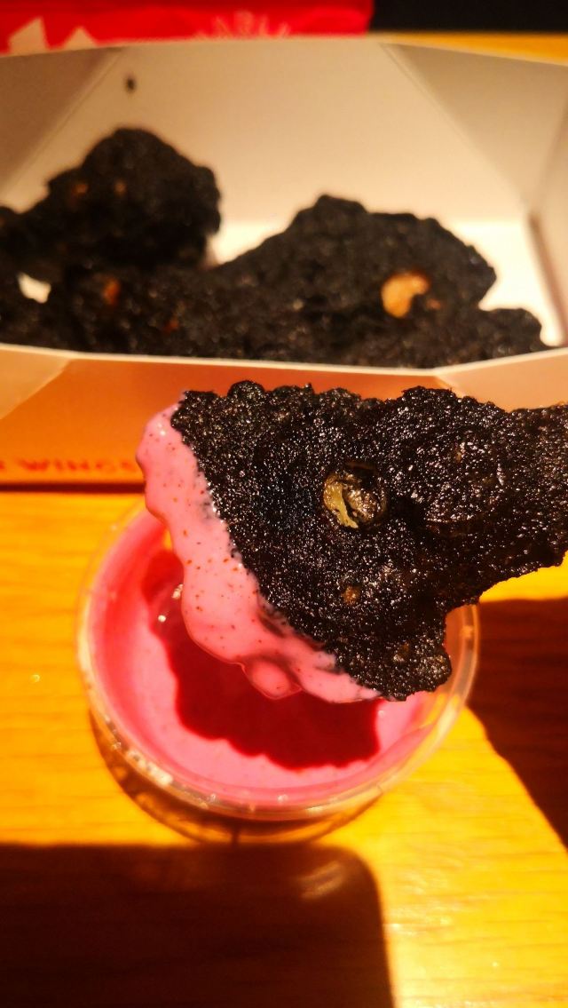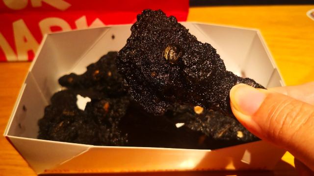 听说粉红家最近出了黑粉系列,特意来尝尝味道。 这家粉红汉堡开在巨鹿路158的负一层里,整个商场没有什么人气的样子,进进出出的大多是一些送餐员。 点了一份黑粉鸡翅,店里现炸,等了大概一刻钟左右的时间,打包带走,和朋友碰面的时候拿出了吃,发现打包带了没有放一次性手套。 鸡翅外面黑色的表皮被炸的太焦了,有些地方吃起来硬硬的,里面的鸡肉却还是很柔嫩。 粉红色的酱汁应该是这道料理的精华,酸酸甜甜的口感里带着一丝辛辣,让烤鸡翅平添了不少的风味。
