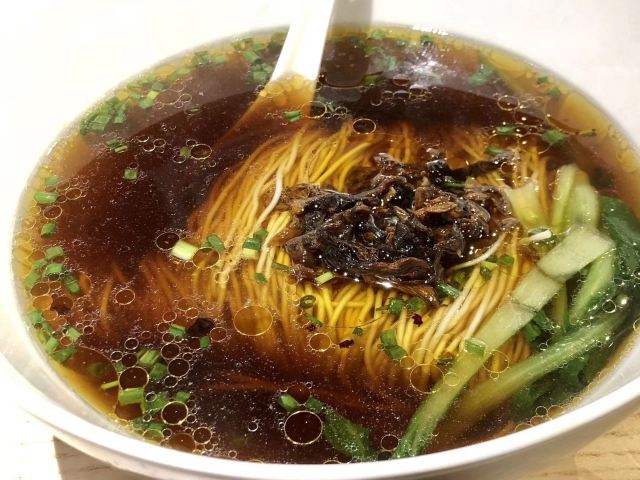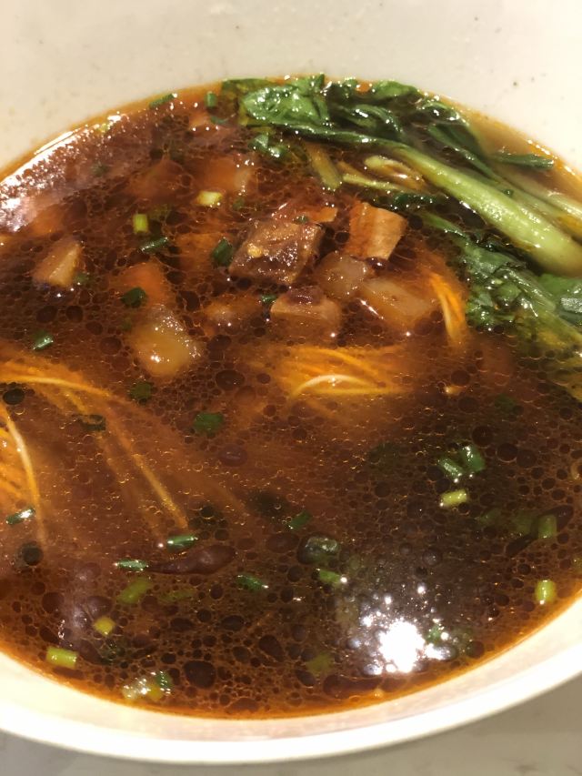 这家刚开张就人气爆棚的本帮面馆不去,你就不算痴狂的追面人! 不管小馋猫怎么天马行空,我就一个套路,这家才开了没多久,就被圈友狂种草的收藏店,不拔了它就是不甘心。 已是过了饭点的下午茶时段,周末的小店却依然坐满了人,巨高的挑高让不大的空间显得并不压抑。小馋猫见小店只是个面馆,一脸的不开心,“还说带我吃好吃的……”怏怏地嘟哝着。 并不理会他的我,一口气把圈友们的推荐一个个点下来,却发现一次根本点不完。当那再熟悉不过的一碗碗,把桌面塞得满满当当,真把我吓坏了,乖乖!这量也忒大了些。 二寸笋尖拷肉,酱爆猪肝,酱爆腰花,现炒鳝丝,椒麻牛蛙,咸菜墨鱼,红烧大排,罗汉上素……这哪里只是现炒浇头,分明是一桌本帮大菜的节奏。小馋猫紧绷着的脸,终于绽开了笑。 那拷肉里的笋真的只用最嫩的笋尖,吃在嘴里根本没有纤维塞牙的麻烦;那猪肝看似厚切,咬开还带着柔柔的粉,刚断生却不觉炒过头才有的沙硬感;那爆炒的腰花开刀密密象绽放的花,还没有一丝烦人的膻味;那鳝丝劲道里带着爽滑,撒满的胡椒在酱味浓烈里提携着味蕾;那洁白如玉的蛙肉吃在嘴里的嫩滑感,也只有现杀才有如此的鲜活;那大排大得能盖住如今流行的小V脸,葱拷的香直接诱惑着嗅觉,让食欲象坐上了火箭直副天顶盖;那罗汉里嵌满了比发丝还要细密的发菜,在发亮的油面里散发着神采…… 这真的是家面店吗?这浇头做得如此一丝不苟的考究,这食材选得如此不惜成本的顶真,连土生土长在上海的我,都仿佛被唤醒了尘封的记忆,这家面店的老板到底还想不想赚钱?哈哈哈,真心有些心疼老板的不管不顾。 已经很久不吃碳水主食的我,为了它家那碗招牌不二的蕈油红汤面,开了戒!如今这世面上,红汤面有见,自家熬的蕈油红汤面还真心难得一见。那野生菌风干才有的香,熬透才有的鲜,让那口面变得入木三分,回味悠长。 忘了谁狠命推荐的这款七巧烧麦,我要给你点上100个赞。才4元一个的单价,个头还真是不算小。轻薄的面皮里,包裹着肉丁,鸭胗,香菇,笋丁,开洋……还有啥?这七巧指的是里内的七宝?我数不过来,却回香在酱浓绵软的糯米饭里,无法自拔。 一阵的风卷残云,胃已被撑得不能动弹。小馋猫一边打着饱嗝,一边嚷嚷着打包烧卖,还一个劲儿地说明天再来,摩羯座的专注或许面店的老板最最懂,要么不爱,要么爱得覆水难收。