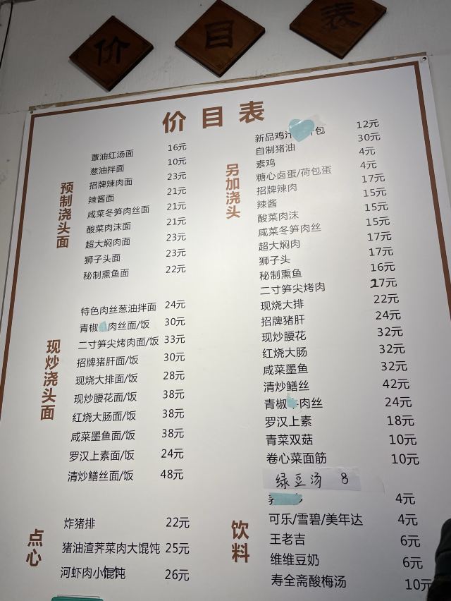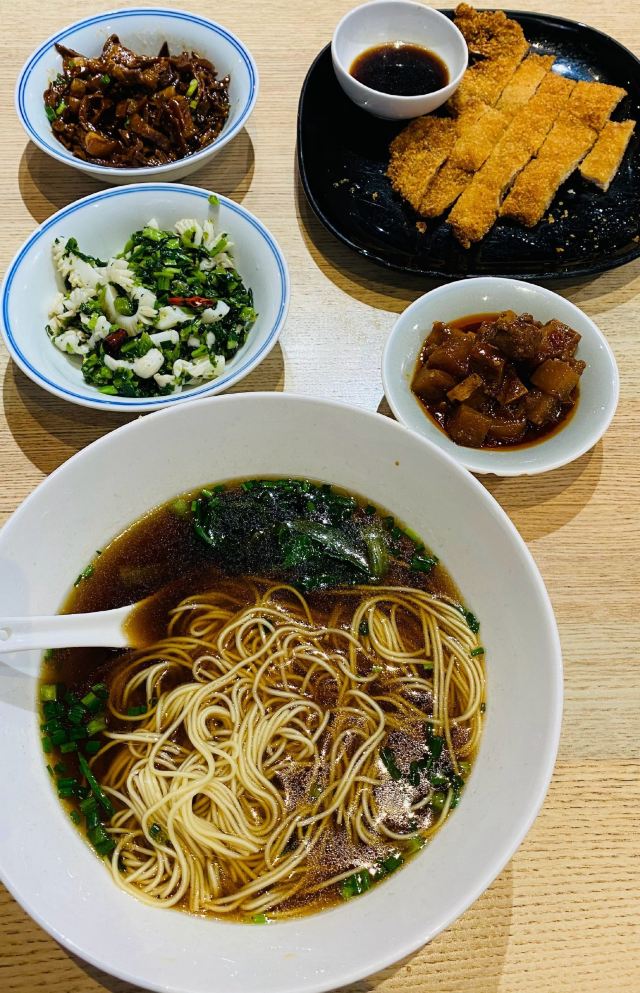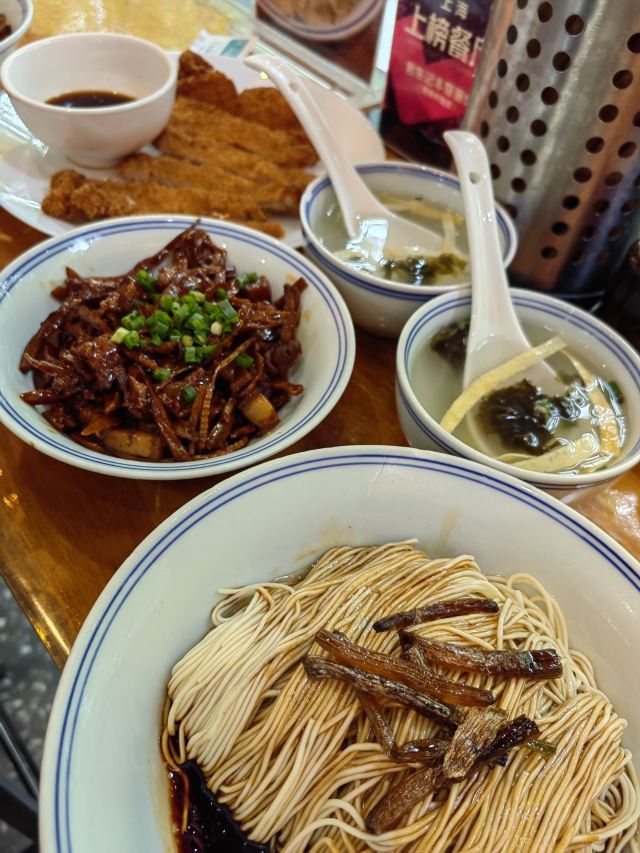 蕈油红汤面,肉丝葱油拌面,辣肉面,炸猪排,罗汉上素,荠菜猪油渣大馄饨,酱爆猪肝,泡椒牛蛙面,现烧大排,响油鳝丝面,鸡杂面,咸菜黄鱼面,糖心酱蛋,现炒鳝丝,苏式焖肉面,大肠面,红烧大排,辣酱面,牛蛙浇头面,上海重油炒面,自制熏鱼面,现炒猪肝,本帮熏鱼,大肠,酱爆腰花面,辣肉,二寸笋尖烤肉,红烧大肠饭,焖肉,咸菜墨鱼饭,现炒腰花,酱爆猪肝面,咸菜墨鱼,豉油鸡,大馄饨,荠菜肉丝炒年糕配汤,素鸡,葱油面,二寸笋尖拷肉面,青菜双菇,素三丝冷面,葱油拌面