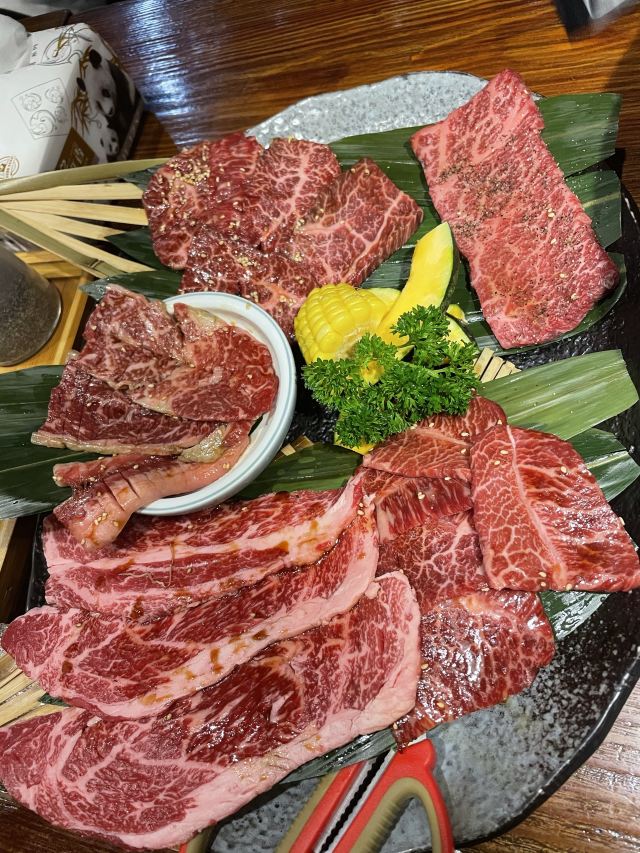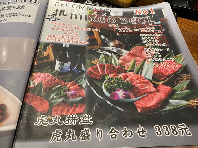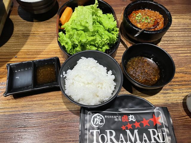 虎丸特上牛里脊,牛尾汤,虎丸拼盘,特上牛小排,牛肉拌饭酱,特上横膈膜,厚切特级牛舌,冰激凌,牛肉米,海鲜饼,横膈膜,和牛上等牛小排,烤肉酱,牛肉酱,撒撒米,生菜牛肉米,名物牛舌,肉酱拌饭,虎丸特上牛外脊,黄油,肉糜包生菜,五花肉,米饭,黄油蘑菇
