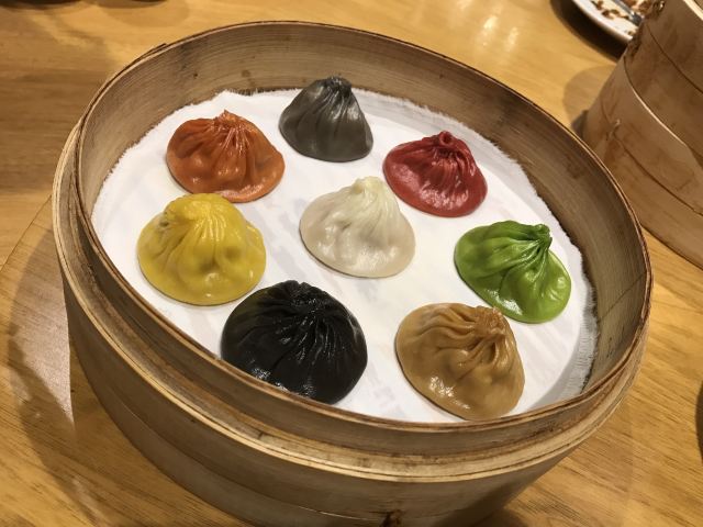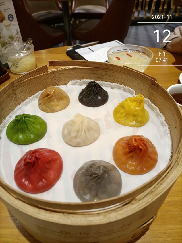 秋趣乐忻皇朝(上海中心大厦店) 地址:银城中路501号上海中心B2层 交通:地铁2号线陆家嘴站6号口出,沿上海中心方向,步行约6分钟 乐忻餐饮是近年来声誉越来越好的一个品牌,曾经领略过乐忻经典的美味佳肴,这次特意去了乐忻皇朝,品尝他家的特色点心饱口福。 餐厅在上海中心大厦地下二层,两家店并列(经典与皇朝),虽然好找,容易搞错哈。 乐忻皇朝以点心为主,餐厅布局也比较大众化,干净明亮,午餐时分,来这里用餐的商务人士不少,可见生意不错。 双人配餐,点心为主,精致多样,很享受。 【特色皇朝小笼包】 一上桌被惊艳到了,五颜六色煞为美观,一开始还以为外皮不同色,馅是一个馅,没想到,八个馅是不一样的。商家还专门给了一份介绍,分别是原味、丝瓜、鹅肝、黑松露、芝士、蟹粉、蒜香、川味。只是我仅尝到了蒜香和芝士的,好遗憾,以后还得专门独自去把八个味道尝一下哈。想说的是,小笼包皮薄,汤足,味浓,堪称精品。 【黑珍珠流沙包】口感很好,咸蛋黄的流沙,好吃。 【萝卜丝饼】新鲜出炉,酥皮很烫,好吃略油。 【瑶柱芙蓉赛螃蟹】烹调很讲究,蛋白做的芙蓉稠度适当,上桌后再把生蛋黄搅拌,但是口感一般,感觉如果放点生姜糖醋调料,吃出蟹味来反而好了。 【芝麻酱油麦菜】美观爽口,蘸上芝麻酱,味道不错。 【红油抄手】馄饨馅鲜美,不是很辣,吃起来劲道。 【柠檬芦荟桂花蜜】【清凉雪梨胖大海】最后两道甜水,相对点心比较一般。