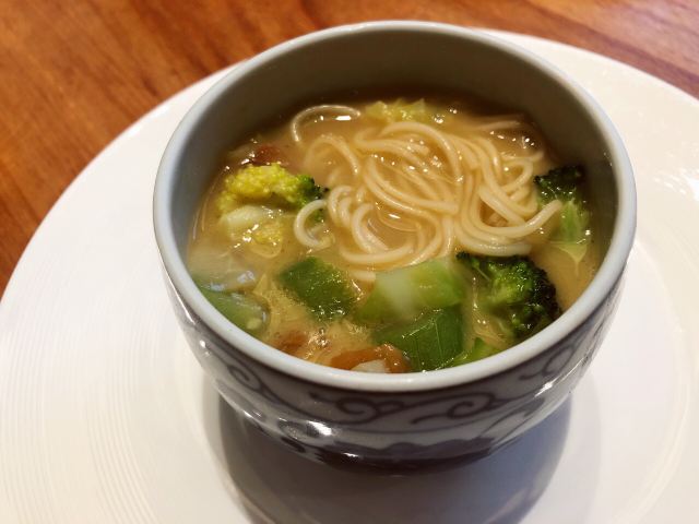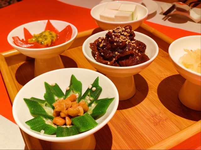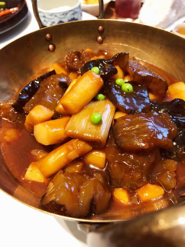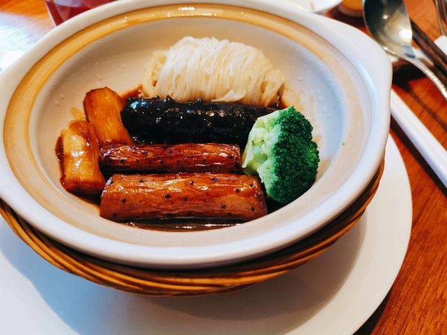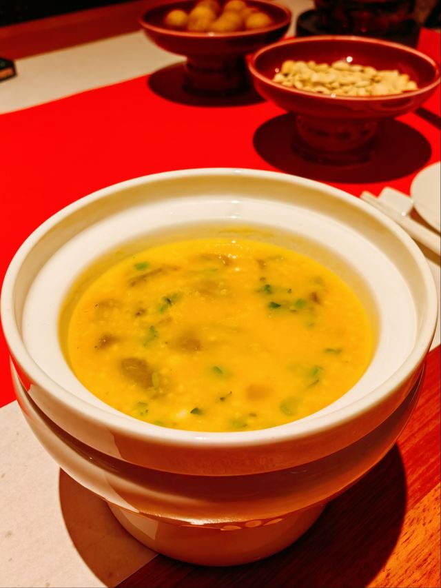 老爸过生日,纠结了好久要选在哪家请他吃饭,朋友推荐了这家膳道,据说即美味又养生。 店铺里的装修,看起来给人一种高山流水的闲适情趣,清淡却让人舒服。 就餐前,先奉上一碗黄色的玉米糊,搭配四色的餐前冷盘,都说吃五色好气色,膳道的养生体验再每一道餐食里。其实这道冷盘就做的很有特色,寿司里的米是用红菜头之浸过的、小小的鹌鹑蛋里面竟然是溏心的。 卤水拼盘,里面有一种叫鱼耳的菌类,比木耳厚,口感却依然脆嫩;最为配菜的洋葱,事先也腌制过,口感变得鲜甜了。 油盐水焗东海野生黄鱼,一人一位的大黄鱼,端上来一掀开锅盖,就闻到一股鲜咸的香味。鱼肉自然是细软鲜嫩的,而鱼骨也柔糯到可以直接吃掉了。 葱烧有机辽参,以前吃过一些辽参的料理,一整只辽参拿来料理,很有可能作料的味道只附着在辽参的表面,里面却是无味的。而这道菜里的辽参,从里到外都是香嫩入味的,熬煮出的卤汁,同样是鲜美的,于是搭配的铁棍山药、卷面、绿椰菜,甚至是大葱段也没放过,都拿来蘸着卤汁吃掉了。 每位还配了一份鲜石斛养生功夫汤,清口的同时又滋补。 菜品都是一道道有序的上桌,每上一道菜,店员都会介绍菜式里的养生元素。
