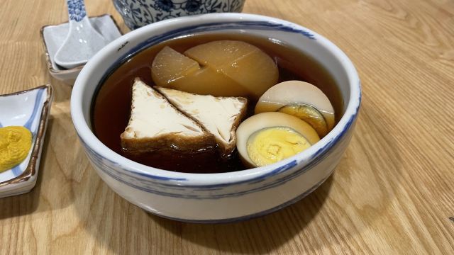 很喜欢吃冷荞麦面的我,竟然不知道公司附近有一家挺有名的荞麦面店! 周日晚饭时间,店里也没有坐满人,可能和疫情有关,到处都检查很严格,本来还以为要排队的。 服务很一般,没有主观能动性。店里很多日本人,也有其他欧美人。服务员貌似会听会讲一些日语。 点了冷荞麦面、豆腐皮饭团、关东煮3样、茶泡饭、抹茶冰激凌、可尔必思,总花费184元,毛巾收费1元,不需要的话,千万不要打开。 第一轮上菜还挺快的。关东煮、茶泡饭、豆腐皮饭团、冷荞麦面一下子都上来了。 关东煮3样的价格是25元,还有5样、8样之类的,不用纠结选什么,因为你没的选。然后,我果然还是比较喜欢便利店的关东煮,可能个人就是喜欢煮得时间比较久的那种。25元3样的关东煮,上来的没有一个是荤的,哈哈!还好有我喜欢的萝卜,就是有点硬。汤的味道不错,小朋友喜欢,比较清淡,不会很甜很咸很鲜。 吃完发现最喜欢的是豆腐皮饭团和茶泡饭。一份豆腐皮包饭有2个,小朋友吃了一个不够,后来又叫了一份。真的是非常好吃。饭里貌似放了油条颗粒,一口咬在嘴里,一种神奇的空气感。小朋友不喜欢茶泡饭,但是米饭星人我就好这一口!有四种口味可以选,我也不知道有啥区别,选了梅子味的没有后悔。呼噜呼噜一碗茶泡饭下去,我竟然还有胃口继续吃荞麦面。问服务员多要了一份汤汁给小朋友,但是小朋友说面的表面有沙沙的口感,她不是很喜欢。所以差不多一份面都是我吃的。我一直去纹兵卫吃冷荞麦面的,相对来说,感觉万蔵的面硬一点,个人应该还是比较喜欢纹兵卫的。最后上的抹茶冰激凌浸泡在红豆沙中,红豆沙很甜,但抹茶是微苦的,所以中和之后味道就比较奇妙了,还不错,里面还有几个小圆子。 店里有小隔间可以坐6个人,边上2人桌,中间有4人桌,还有吧台。环境还是比较舒适的。 以后可以去试试午市套餐,不用去比较远的纹兵卫了,真好!