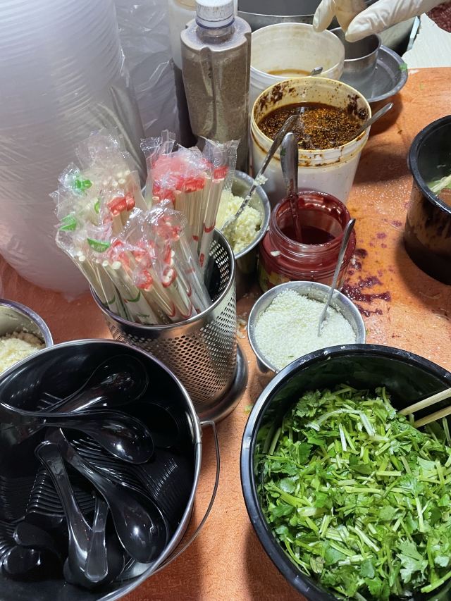 sAviOr_07易记麻辣烫(包头路店),小伙伴说是杨浦有名滴麻辣烫店,特地来的,第一次3.6来遇上没开门,于是第二次又来了。 没有号码牌的,站着排的,看了下等了28分钟,这个完全可以弄个号码牌呀。 店里店外都有座位,先到店里取需要的,然后再到外面来取要的,接着就开始排队,最后排到还能加外面橱窗里的。付好钱就去调料区那块等麻辣烫出来。鸡精、蒜、辣没加。 麻辣烫 平菇、茼蒿菜、菠菜、平菇、油面筋、油条(发黑的)、还加了鹌鹑蛋、土豆片、香菜、莴笋等。莴笋片很老,土豆片还有点生的,绿叶菜黄叶子还在,总体一般般。 特地来没有必要,在附近可以吃吃看,味道是不如虹口罗记川味麻辣烫的。