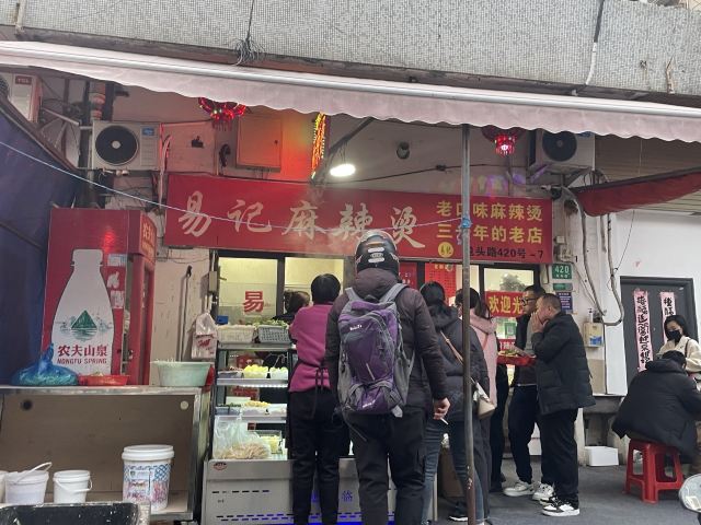 易记麻辣烫(包头路店),小伙伴说是杨浦有名滴麻辣烫店,特地来的,第一次3.6来遇上没开门,于是第二次又来了。 没有号码牌的,站着排的,看了下等了28分钟,这个完全可以弄个号码牌呀。 店里店外都有座位,先到店里取需要的,然后再到外面来取要的,接着就开始排队,最后排到还能加外面橱窗里的。付好钱就去调料区那块等麻辣烫出来。鸡精、蒜、辣没加。 麻辣烫 平菇、茼蒿菜、菠菜、平菇、油面筋、油条(发黑的)、还加了鹌鹑蛋、土豆片、香菜、莴笋等。莴笋片很老,土豆片还有点生的,绿叶菜黄叶子还在,总体一般般。 特地来没有必要,在附近可以吃吃看,味道是不如虹口罗记川味麻辣烫的。