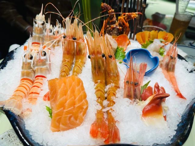 铁板薄烧牛舌,蛋黄酱焗明虾,鳌虾,铁板鹅肝,牡丹虾,焗蟹宝,新西兰螯虾,刺身拼盘,雪蟹腿,鲍鱼,银鳕鱼,厚烧牛舌,抹茶冰激凌,马粪海胆,咖啡冻,梅子酒,刺身海胆,三文鱼刺身,烤牛舌,铁板薄牛舌饭套餐,芒果汁,黑莓汁