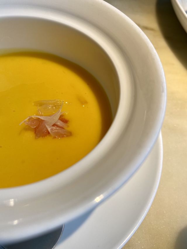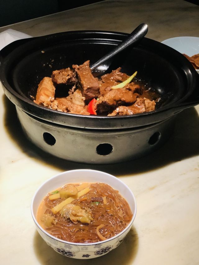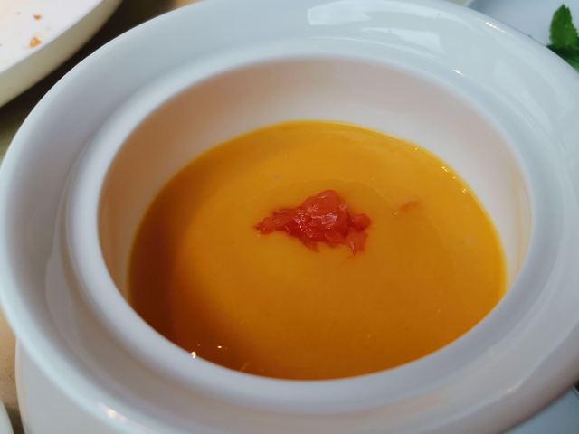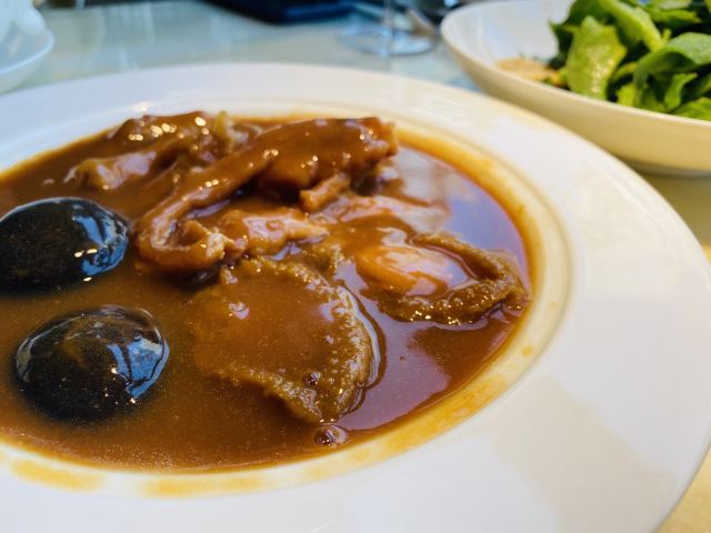 凹凸曼和小伙伴提前就预定了这家位于环球金融中心的【金悦】,结果果然当天客满,几乎都是合家欢过来过节的。上海地标建筑的餐厅果然炙手可热。 每日例汤天天不同,今天是「西洋菜汤」,西洋菜几乎就是潮汕地区的标志性蔬菜了。汤里还有排骨和鸡胗,特别好喝开胃。 「驰名七丛松巷炸豆腐」七丛松巷真的是潮汕古法美食发源地,普宁豆腐无论是蘸薄荷盐水还是甜辣酱都十分美味,咸鲜脆嫩。 「卤角螺」选取南澳本港角螺,肉质肥美,Q弹鲜脆。腌制得十分入味。 「铁镬脆皮蚝仔煎」这个真的要比大拇指,虽然满满都是蚝仔,颗颗满膏爆浆,但这种带着海水的咸香味口感真的一点不腥气。连我这种平时对蚝仔煎非常感冒的人,都被俘获。 「鲍汁鹅掌扣鲍鱼」鹅掌软糯入口即化,鲍鱼爽滑,鲜美的高汤最后还淋在米饭上吃了,一点没浪费。 「家嫂姜葱炆牛展」这道菜也是店长推荐的,选用得牛前腿肉,上来的时候还是生的,全靠石锅熘到8分熟,肉质鲜嫩。 「杨枝甘露燕盏」入口果香浓郁,甜度适中。 [服务铃]服务: 非常感谢金悦优质的服务,让妈妈度过了一个难忘的母亲节。