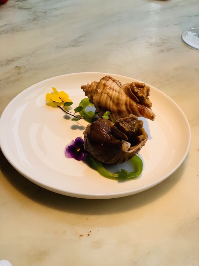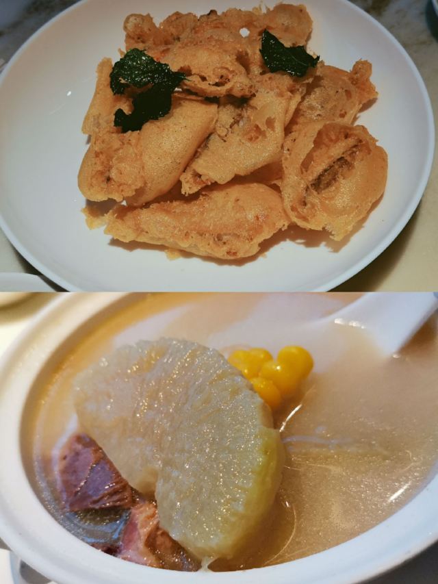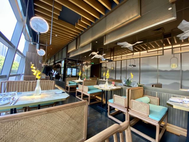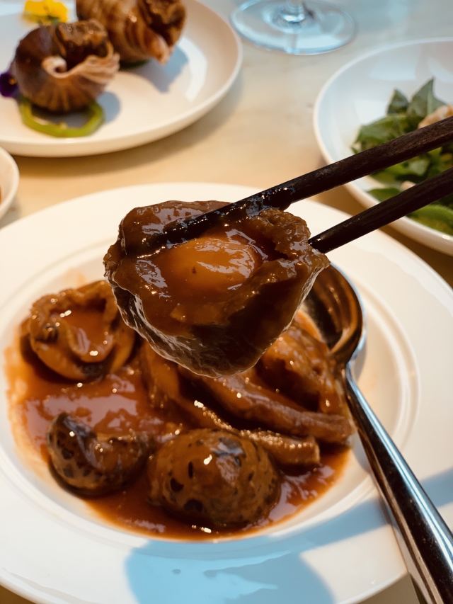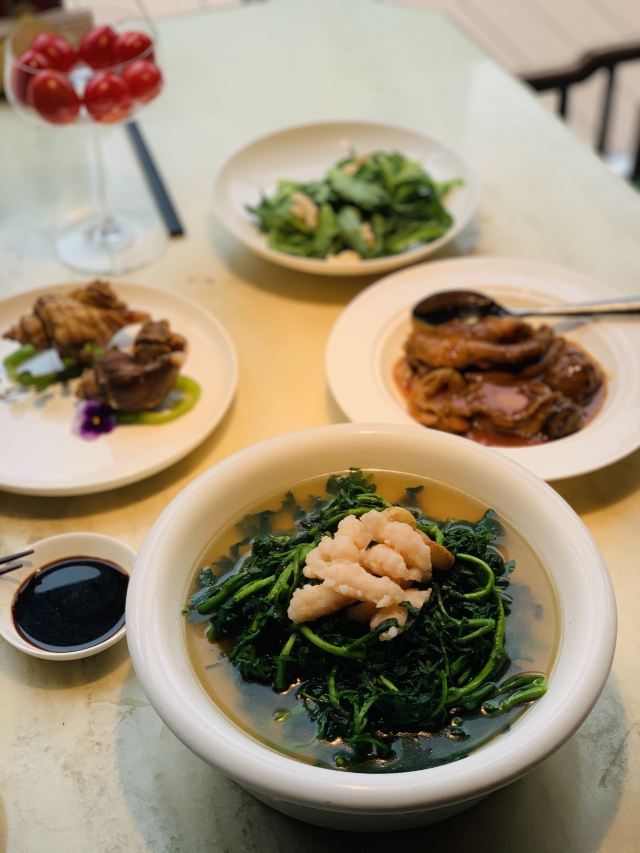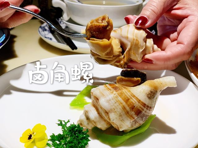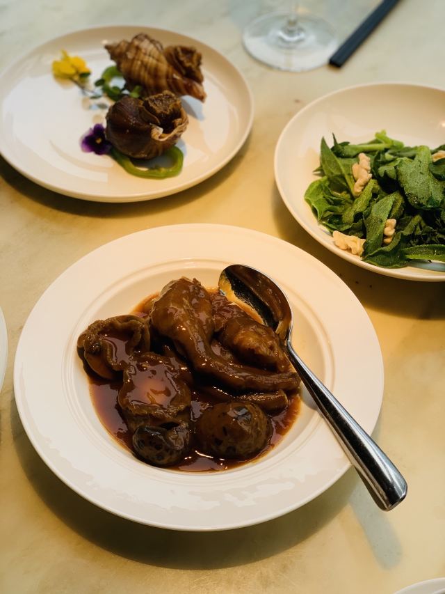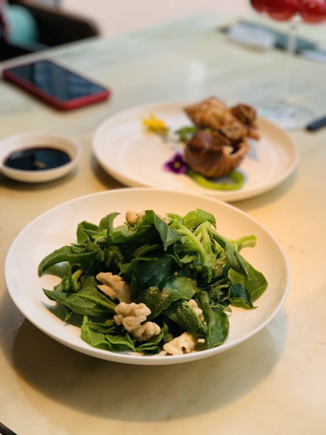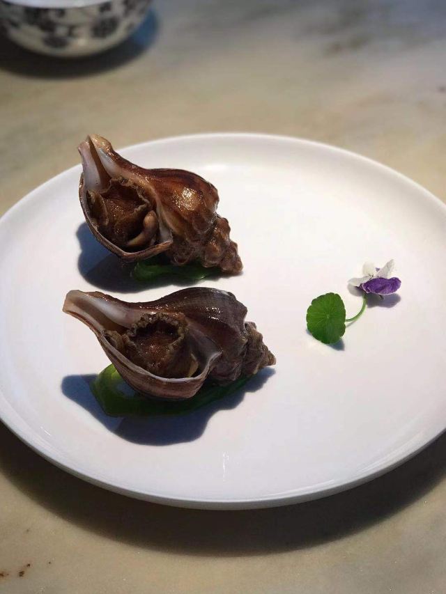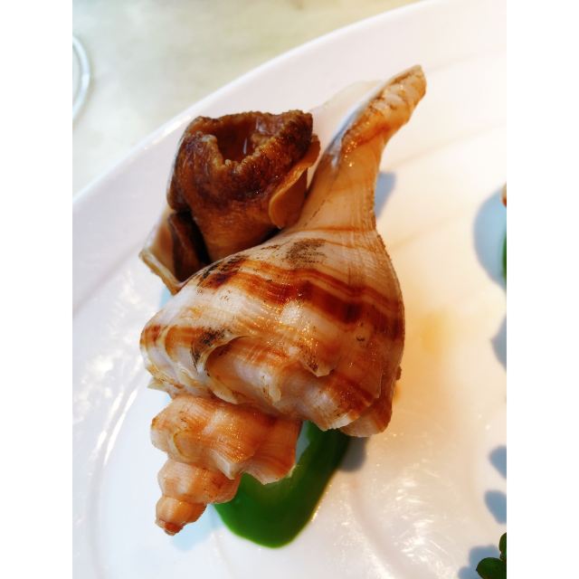 漫漫的鱼仔跟基友一起去吃的,点评爸爸送的年会券让我们享受了一番~~服务好,菜品好,环境好~ 门面看不出有什么特别,进去发现有松、有水、有仙气~扇子、飞鹤等元素显得优雅又有古韵~ 卤角螺的海螺煮的火候和时间很恰当,很容易从壳里拽出来~蘸了芥末很好吃~ 铁镬脆皮蚝仔煎88元,配了两种蘸料:鱼露和辣椒皇。略贵,但是煎的很脆~推荐~ 鲍汁鹅掌扣鲍鱼不错的~鲍鱼不大因为是野生的~配米饭挺好,但是米饭略硬~ 虾滑煮西洋菜98元,略贵,粉粉的虾滑好看,西洋菜微苦,吃不惯~ 杨枝甘露太好吃了,芒果蓉为底,红色和黄色的柚子点缀,味道很正。 临走时还送了伴手礼:凤凰单枞——鸭屎香~(据说每桌都会有~) 服务是高配版的海底捞式的服务,比如海鲜给我们配了2杯气泡酒~送我到门口指导卫生间的位置等~