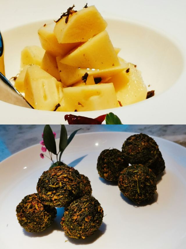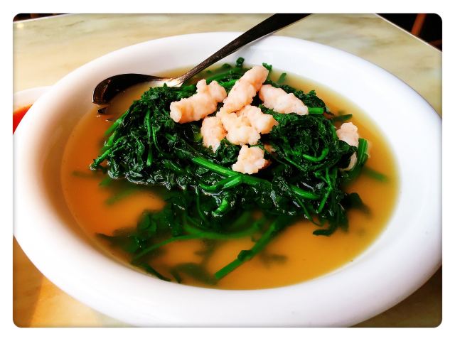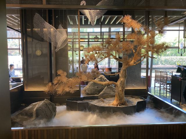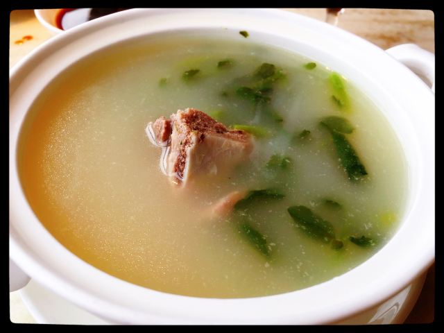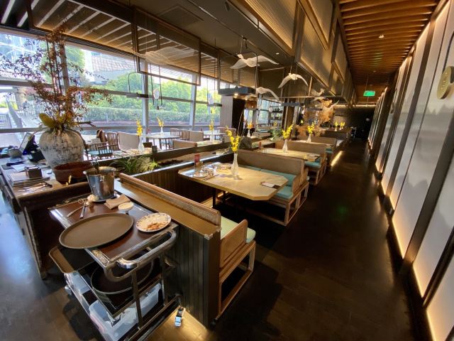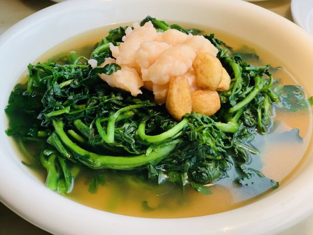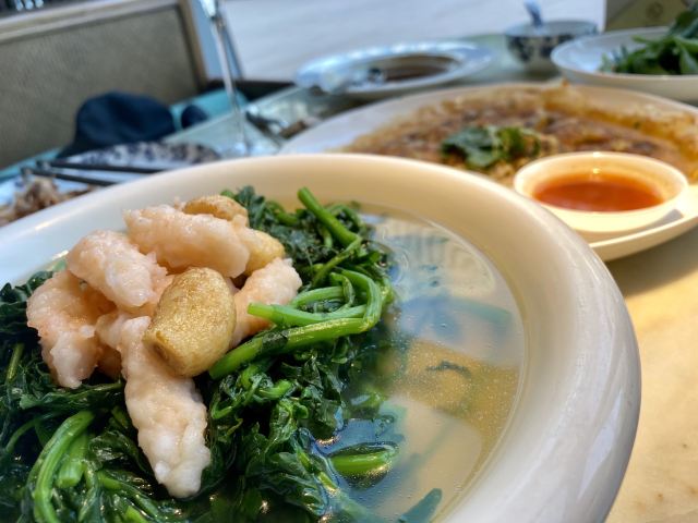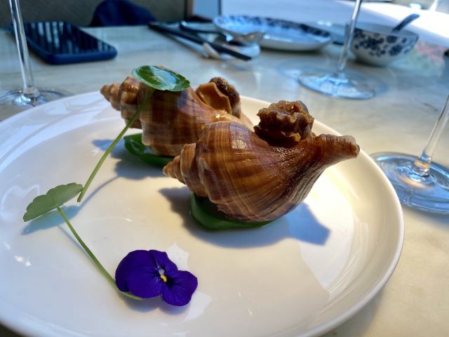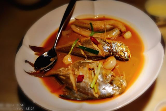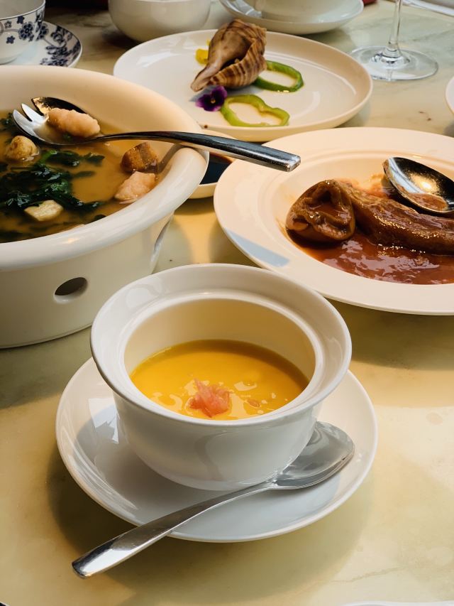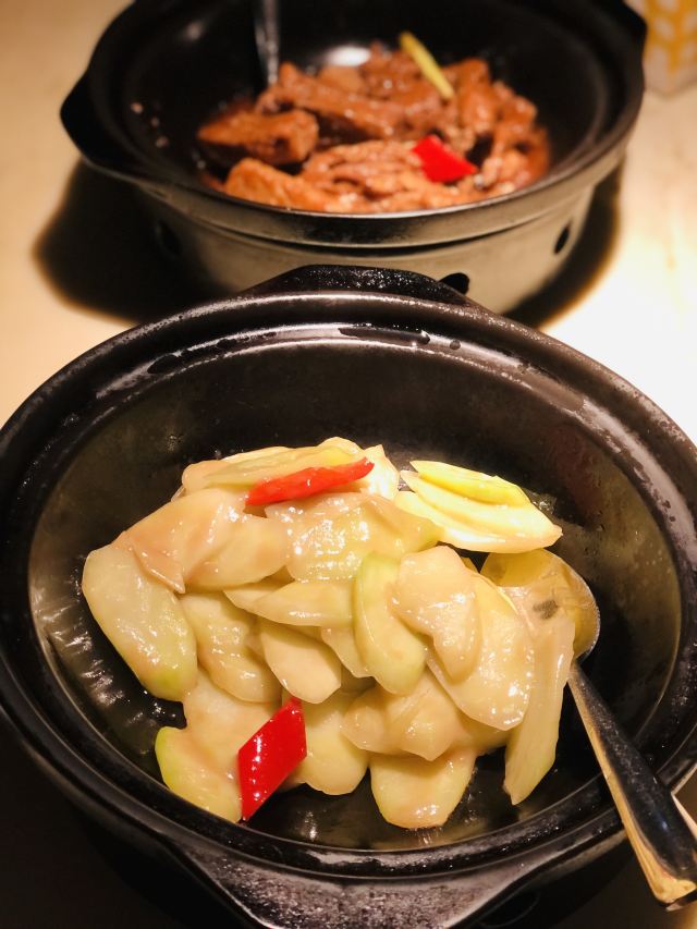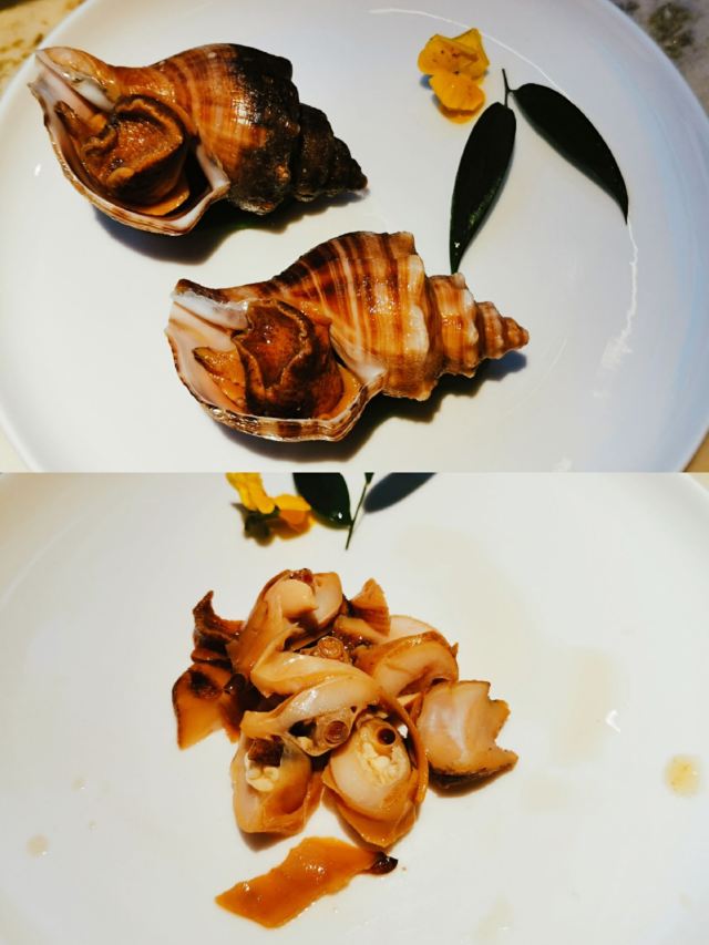 漫漫的鱼仔跟基友一起去吃的,点评爸爸送的年会券让我们享受了一番~~服务好,菜品好,环境好~ 门面看不出有什么特别,进去发现有松、有水、有仙气~扇子、飞鹤等元素显得优雅又有古韵~ 卤角螺的海螺煮的火候和时间很恰当,很容易从壳里拽出来~蘸了芥末很好吃~ 铁镬脆皮蚝仔煎88元,配了两种蘸料:鱼露和辣椒皇。略贵,但是煎的很脆~推荐~ 鲍汁鹅掌扣鲍鱼不错的~鲍鱼不大因为是野生的~配米饭挺好,但是米饭略硬~ 虾滑煮西洋菜98元,略贵,粉粉的虾滑好看,西洋菜微苦,吃不惯~ 杨枝甘露太好吃了,芒果蓉为底,红色和黄色的柚子点缀,味道很正。 临走时还送了伴手礼:凤凰单枞——鸭屎香~(据说每桌都会有~) 服务是高配版的海底捞式的服务,比如海鲜给我们配了2杯气泡酒~送我到门口指导卫生间的位置等~