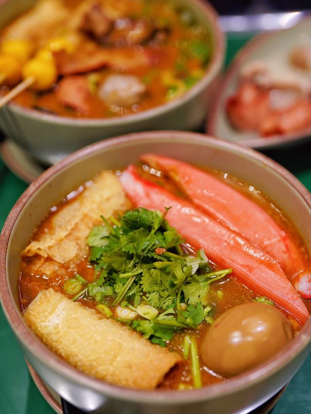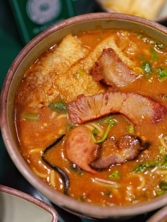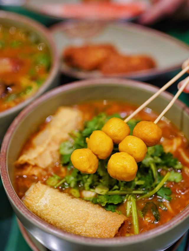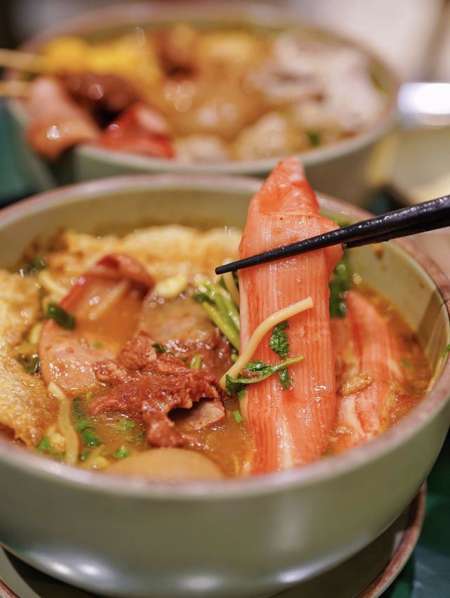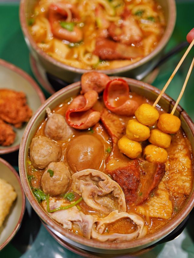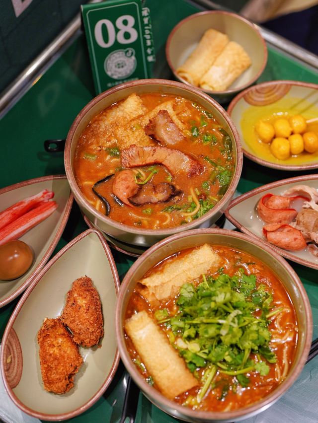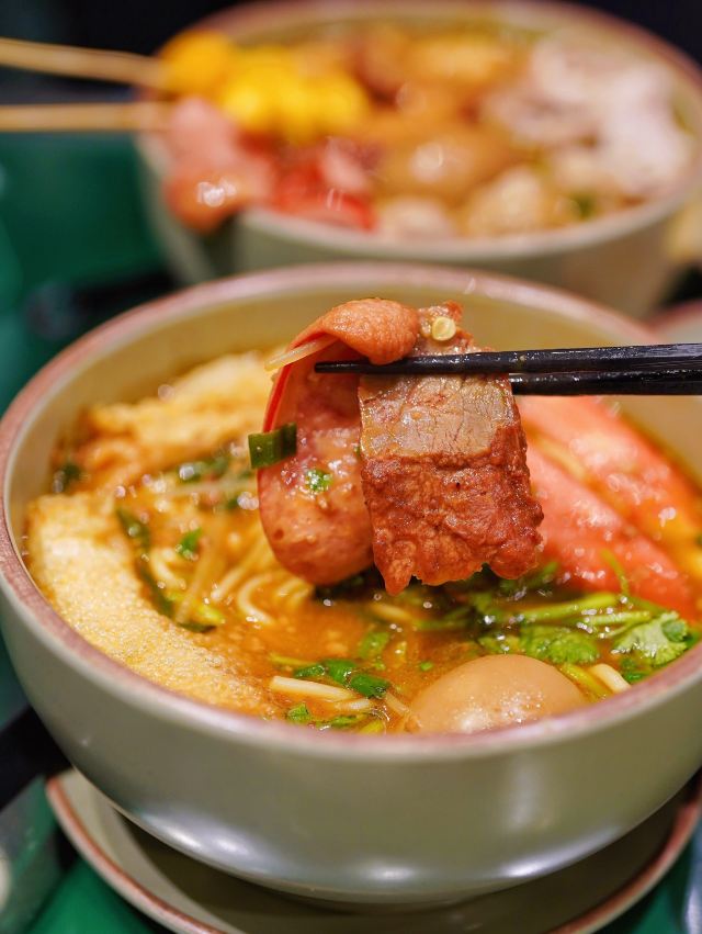 不会吧不会吧❓肥汁米蘭被“绿”了⁉️魔都只此一家的🌟天星码头🌟iapm店,红到极致就是绿💚 🍜招牌炸酱叉烧小锅米线🍜 汤浓料多口味霸道,秘制炸酱融入老火煲煮12h的高汤,吸收筒骨、猪蹄、鸡爪等精华,猛吸一口,让我狠狠爱住了! 肥瘦相间的港式叉烧,大块火腿搭配S 形红肠,还有吸汁小能手响铃卷和腐竹,咱就是说,不亚于吃了一顿小火锅🍲 顺便替你们试了一下小吃,风靡香港街头的🍢咖喱鱼旦🍢,别看个头不大,一口一个完全停不下来哦~ 还有外脆里嫩的🍗虾酱鸡翅🍗,别犹豫,赶紧炫嘴里!