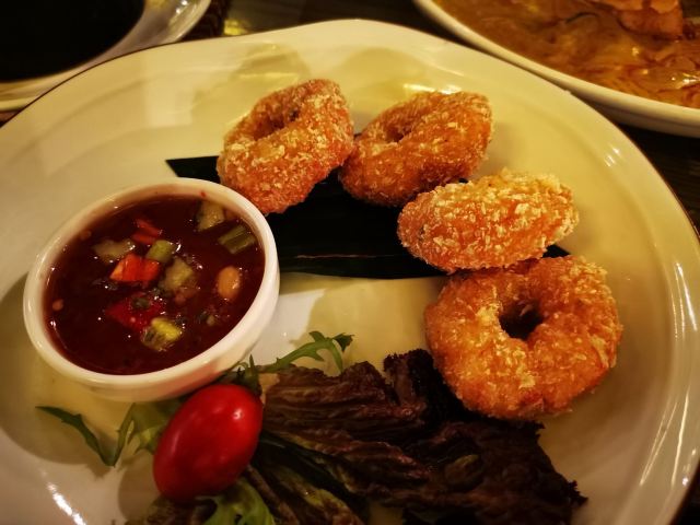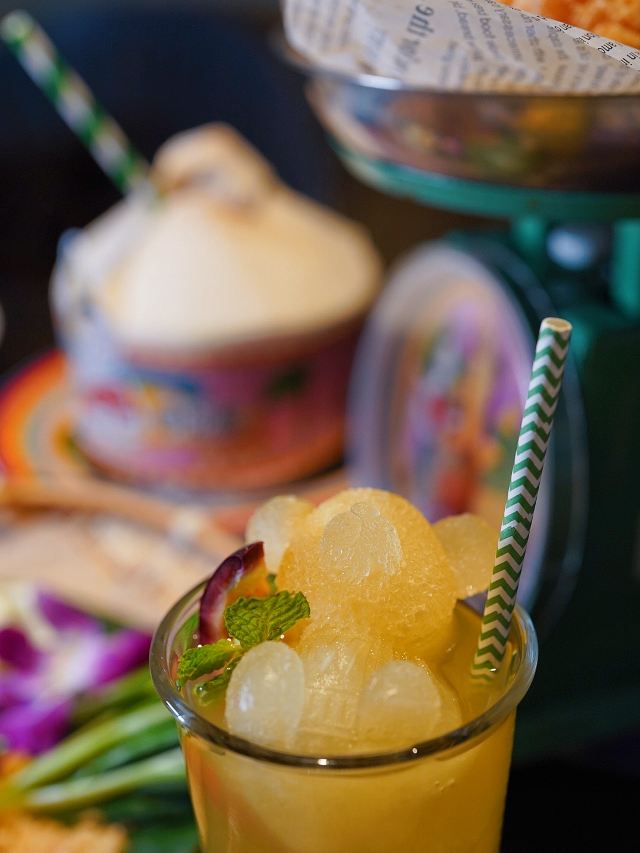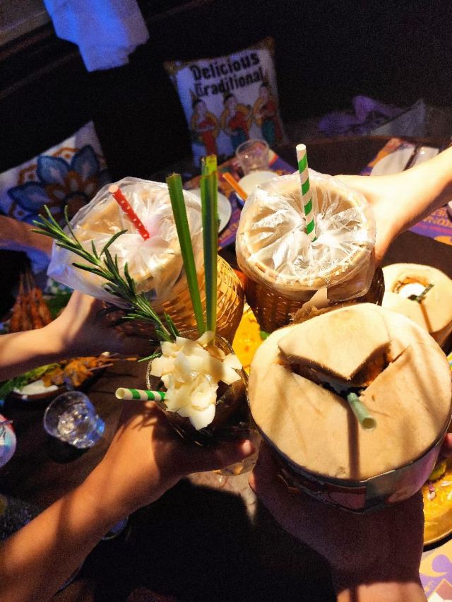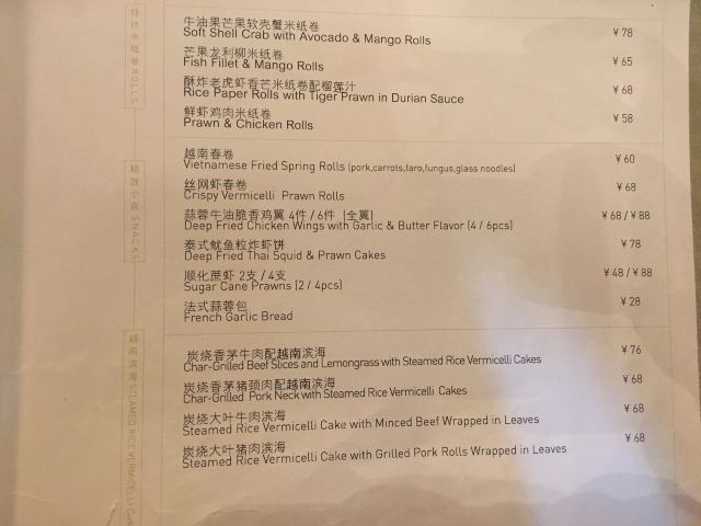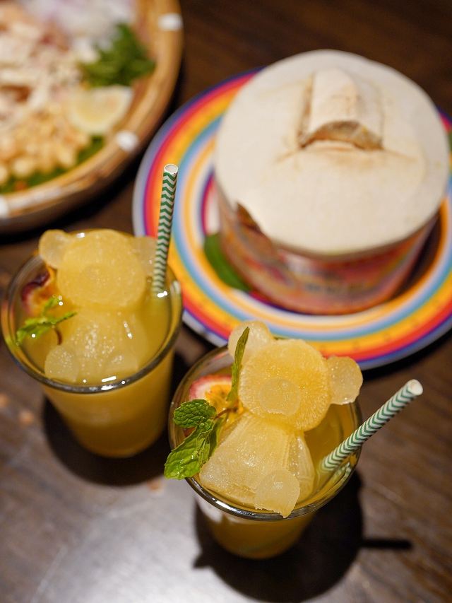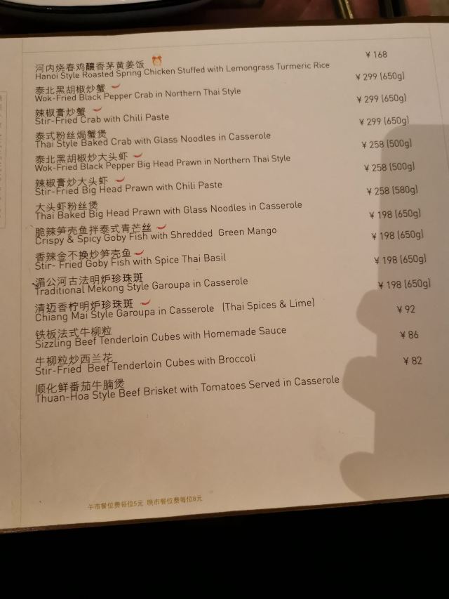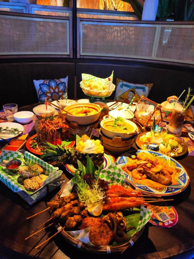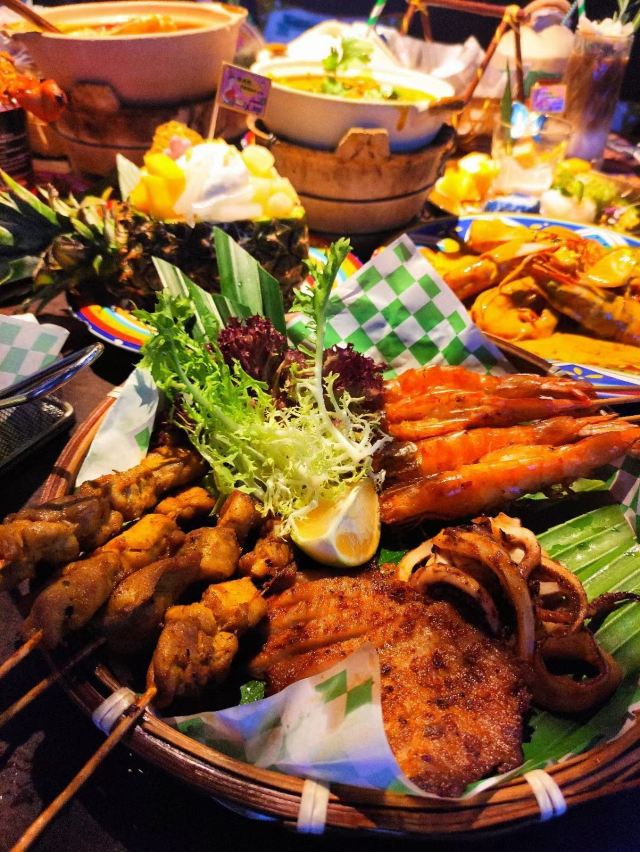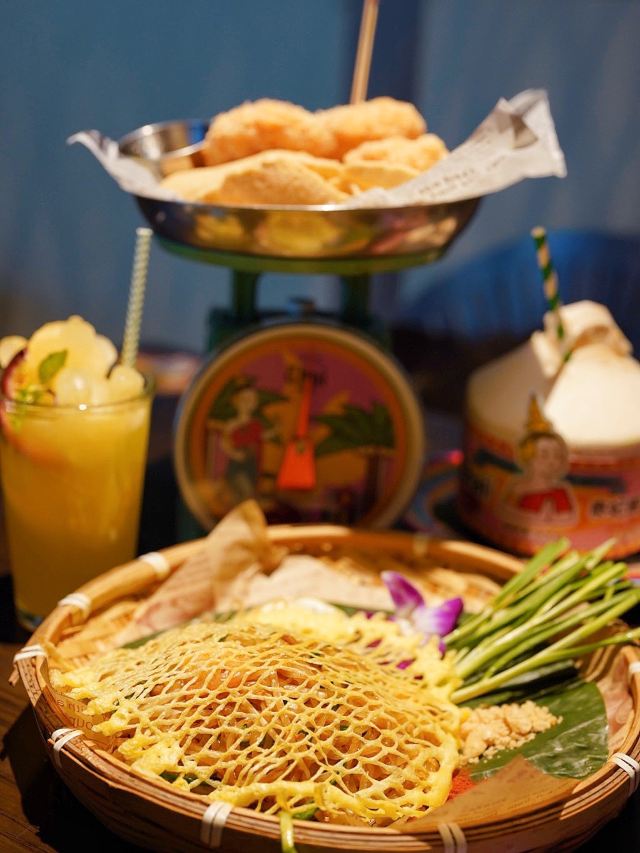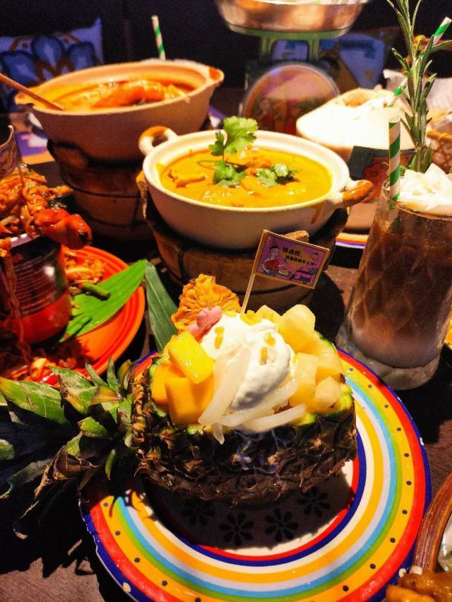 泰式鱿鱼粒炸虾饼,黄咖喱香茅牛腩煲,虾酱炒通菜,香煎越南虾饼,原个椰青海鲜焗饭,泰皇烧春鸡(半只),牛油果芒果软壳蟹米纸春卷,青迈青柠明炉炉鱼,炭烧泰式猪颈肉,香浓古法咖喱炒蟹,香芒芋茸黑白糯米,原个菠萝软壳蟹海鲜炒饭,蛋包海鲜炒金边粉