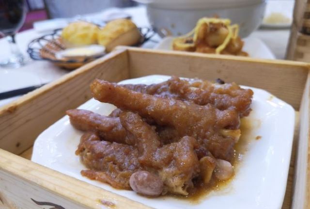 这家店性价比一般,但是鸭子确实不错的。港式片皮鸭非常好吃,一只鸭子就片了最精华的部位,~很脆很脆,从头吃到尾都是脆脆的不油腻,就是有点大一口吃不下也咬不断,因为葱太老了。豉汁蒸凤爪、菠萝包、糯米鸡这三种都没有避风塘好吃。xo萝卜糕还不错挺好吃的。