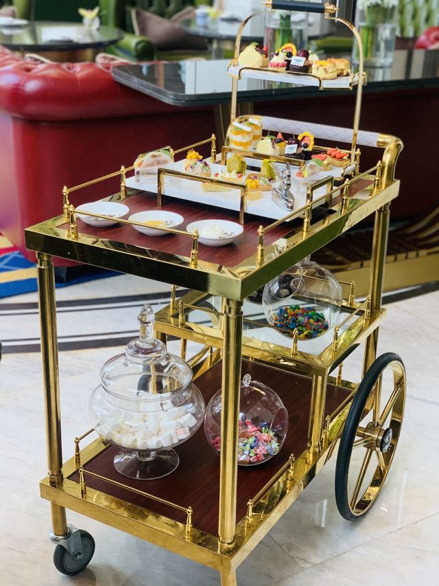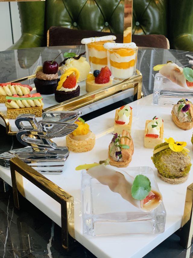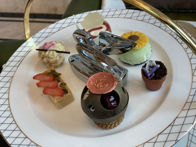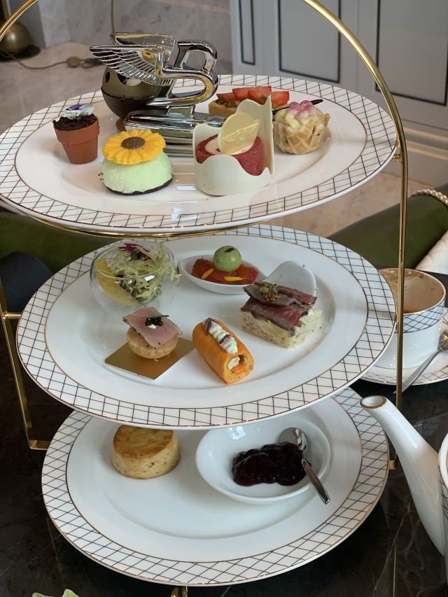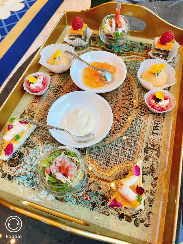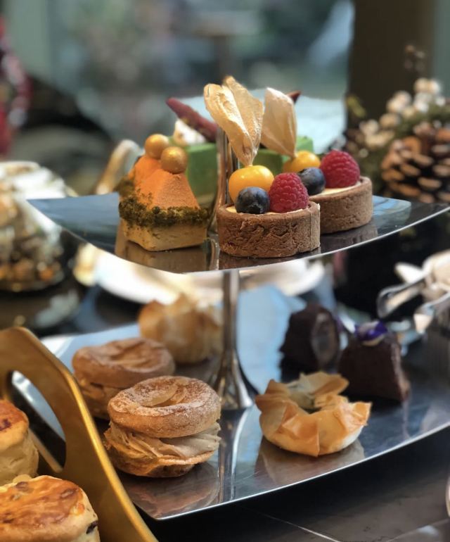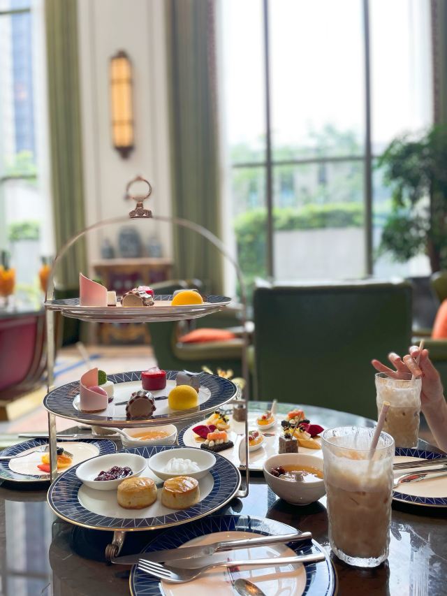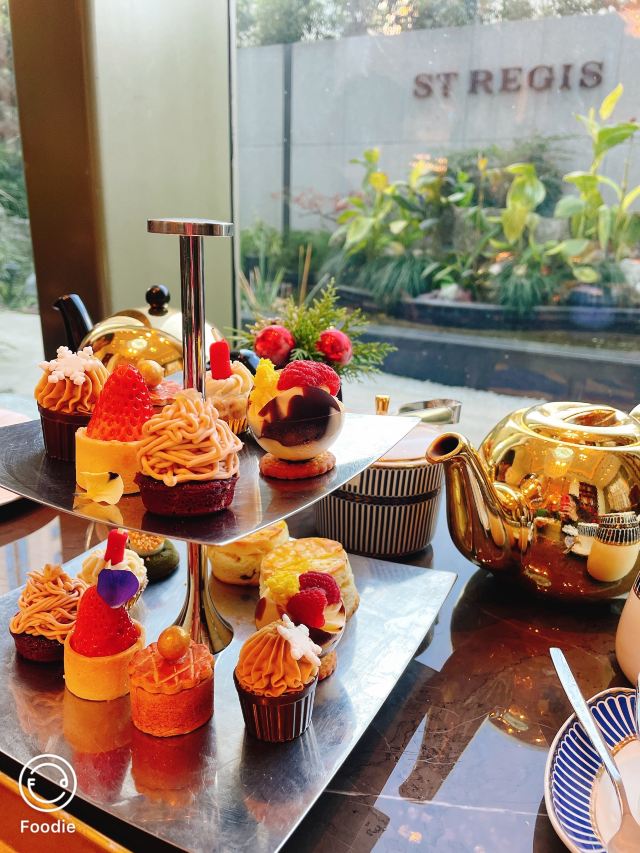 酒店不定时会推出特色下午茶,就是冲着这个去的。提前预约了靠窗的景观座位,能够拍到窗外的瑞吉酒店的招牌。来下午茶的人还蛮多的,几乎满座。订的下午茶2人套餐528元包括一个有三层塔装的点心,还有一个托盘装的,外加咖啡或者茶。量还是蛮多的,又有颜值又好吃。